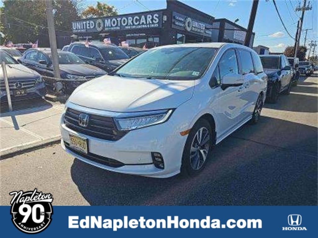This Odyssey is well equipped with 3.61 Axle Ratio, 3rd row seats: split-bench, 4-Wheel Disc Brakes, 7 Speakers, A/V remote: CabinControl, ABS brakes, Adaptive Cruise Control: Adaptive Cruise Control (ACC) with Low-Speed Follow, Air Conditioning, Alloy wheels, AM/FM radio: SiriusXM, Anti-whiplash front head restraints, Apple CarPlay/Android Auto, Auto High-beam Headlights, Auto-dimming Rear-View mirror, Automatic temperature control, Blind Spot Information (BSI) System warning, Brake assist, Bumpers: body-color, CD player, Compass, Delay-off headlights, Driver door bin, Driver vanity mirror, Driver's Seat Mounted Armrest, Dual front impact airbags, Dual front side impact airbags, DVD-Audio, Electronic Stability Control, Emergency communication system: HondaLink, Exterior Parking Camera Rear, Four wheel independent suspension, Front anti-roll bar, Front Bucket Seats, Front dual zone A/C, Front fog lights, Front reading lights, Fully automatic headlights, Garage door transmitter: HomeLink, Headphones, Heated door mirrors, Heated Front Bucket Seats, Heated front seats, Illuminated entry, Knee airbag, Lane departure: Lane Keeping Assist System (LKAS) active, Leather Seat Trim, Leather steering wheel, Low tire pressure warning, Memory seat, Navigation system: Honda Satellite-Linked Navigation System, Occupant sensing airbag, Outside temperature display, Overhead airbag, Overhead console, Panic alarm, Passenger door bin, Passenger seat mounted armrest, Passenger vanity mirror, Power door mirrors, Power driver seat, Power Liftgate, Power moonroof, Power passenger seat, Power steering, Power windows, Radio data system, Radio: 160-Watt AM/FM/HD/SiriusXM Audio System, Rear air conditioning, Rear anti-roll bar, Rear audio controls, Rear reading lights, Rear seat center armrest, Rear window defroster, Rear window wiper, Reclining 3rd row seat, Remote keyless entry, Security system, Speed control, Speed-sensing steering, Speed-Sensitive Wipers, Split folding rear seat, Spoiler, Steering wheel mounted audio controls, Tachometer, Telescoping steering wheel, Tilt steering wheel, Traction control, Trip computer, Turn signal indicator mirrors, Variably intermittent wipers, and Wheels: 19" Machine-Finished Alloy.