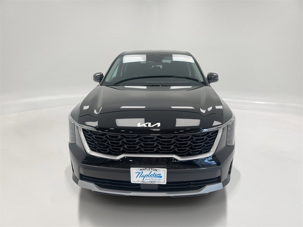 This Sorento is well equipped with Sorento LX, Kia Certified Pre-Owned Certified, 4D Sport Utility, 2.5L I4 DGI DOHC 16V LEV3-SULEV30 191hp, 8-Speed Automatic, FWD, Ebony Black, Black Cloth, 17" Alloy Wheels, 3rd row seats: split-bench, 4-Wheel Disc Brakes, 6 Speakers, ABS brakes, Air Conditioning, Alloy wheels, AM/FM radio: SiriusXM, Apple CarPlay & Android Auto, Auto High-beam Headlights, Brake assist, Bumpers: body-color, Carpeted Floor Mats, Cloth Seat Trim, Delay-off headlights, Driver door bin, Driver vanity mirror, Dual front impact airbags, Dual front side impact airbags, Electronic Stability Control, Emergency communication system: 911 Connect, Exterior Parking Camera Rear, Four wheel independent suspension, Front anti-roll bar, Front Bucket Seats, Front Center Armrest, Front reading lights, Fully automatic headlights, Heated door mirrors, Illuminated entry, Knee airbag, Low tire pressure warning, Occupant sensing airbag, Outside temperature display, Overhead airbag, Overhead console, Panic alarm, Passenger door bin, Passenger vanity mirror, Power door mirrors, Power steering, Power windows, Radio data system, Radio: AM/FM Standard Sound System, Rear anti-roll bar, Rear reading lights, Rear seat center armrest, Rear side impact airbag, Rear window defroster, Rear window wiper, Remote keyless entry, Security system, Speed control, Speed-sensing steering, Split folding rear seat, Spoiler, Steering wheel mounted audio controls, Tachometer, Telescoping steering wheel, Tilt steering wheel, Traction control, Trip computer, Turn signal indicator mirrors, and Variably intermittent wipers.