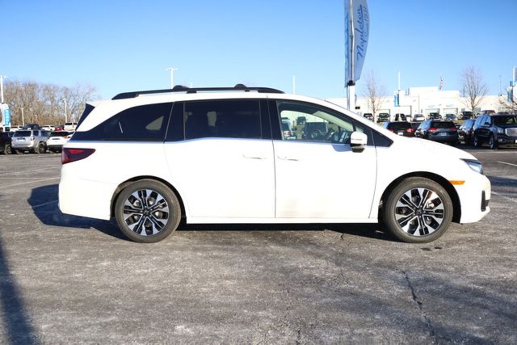 This Odyssey is well equipped with 11 Speakers, 3rd row seats: split-bench, 4-Wheel Disc Brakes, ABS brakes, Adaptive Cruise Control: Adaptive Cruise Control (ACC) with Low-Speed Follow, Air Conditioning, Alloy wheels, AM/FM radio: SiriusXM, Anti-whiplash front head restraints, Apple CarPlay/Android Auto, Auto High-beam Headlights, Auto-dimming door mirrors, Auto-dimming Rear-View mirror, Automatic temperature control, Blind Spot Information (BSI) System warning, Brake assist, Bumpers: body-color, Compass, Delay-off headlights, Driver door bin, Driver vanity mirror, Driver's Seat Mounted Armrest, Dual front impact airbags, Dual front side impact airbags, Electronic Stability Control, Emergency communication system: HondaLink, Exterior Parking Camera Rear, Four wheel independent suspension, Front anti-roll bar, Front Bucket Seats, Front dual zone A/C, Front fog lights, Front reading lights, Fully automatic headlights, Garage door transmitter: HomeLink, Heated & Ventilated Front Bucket Seats, Heated door mirrors, Heated front seats, Heated steering wheel, Illuminated entry, Knee airbag, Lane departure: Lane Keeping Assist System (LKAS) active, Leather steering wheel, Low tire pressure warning, Memory seat, Navigation system: Honda Satellite-Linked Navigation System, Occupant sensing airbag, Outside temperature display, Overhead airbag, Overhead console, Panic alarm, Passenger door bin, Passenger seat mounted armrest, Passenger vanity mirror, Perforated Leather-Trimmed Seats w/Piping, Power door mirrors, Power driver seat, Power Liftgate, Power moonroof, Power passenger seat, Power steering, Power windows, Radio data system, Radio: 500-Watt AM/FM/HD Premium Audio System, Rain sensing wipers, Rear air conditioning, Rear anti-roll bar, Rear audio controls, Rear reading lights, Rear seat center armrest, Rear window defroster, Rear window wiper, Reclining 3rd row seat, Remote keyless entry, Security system, Speed control, Speed-sensing steering, Speed-Sensitive Wipers, Split folding rear seat, Spoiler, Steering wheel mounted audio controls, Tachometer, Telescoping steering wheel, Tilt steering wheel, Traction control, Trip computer, Turn signal indicator mirrors, Variably intermittent wipers, Ventilated front seats, and Wheels: 19" Machine-Finished Alloy.
