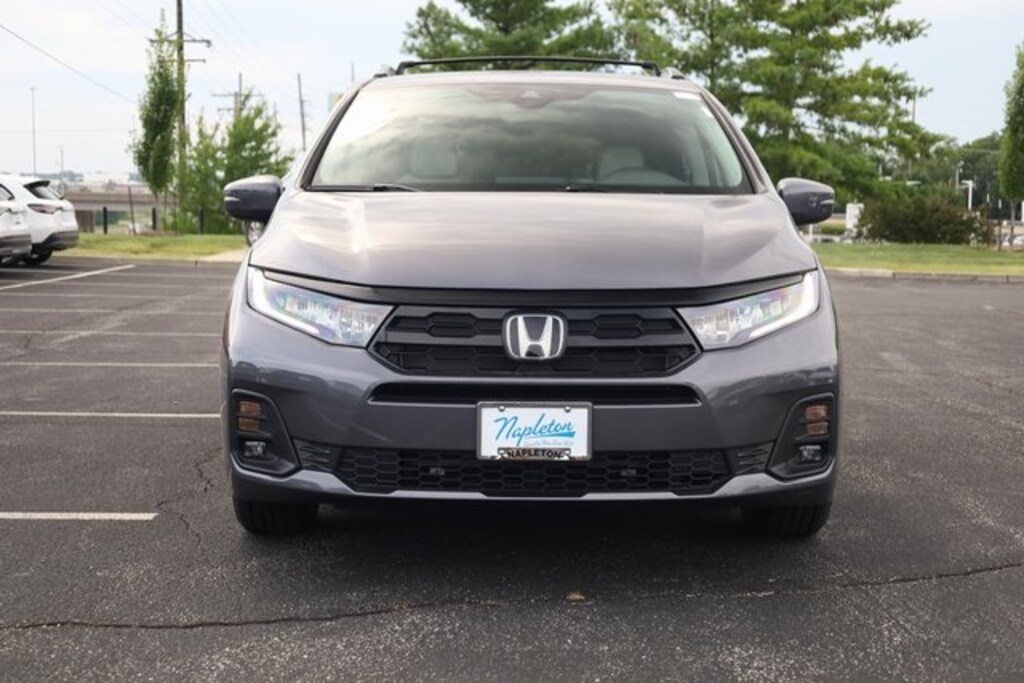 This Odyssey is well equipped with 3rd row seats: split-bench, 4-Wheel Disc Brakes, 7 Speakers, ABS brakes, Adaptive Cruise Control: Adaptive Cruise Control (ACC) with Low-Speed Follow, Air Conditioning, Alloy wheels, AM/FM radio: SiriusXM, Anti-whiplash front head restraints, Apple CarPlay/Android Auto, Auto High-beam Headlights, Auto-dimming Rear-View mirror, Automatic temperature control, Blind Spot Information (BSI) System warning, Brake assist, Bumpers: body-color, Compass, Delay-off headlights, Driver door bin, Driver vanity mirror, Driver's Seat Mounted Armrest, Dual front impact airbags, Dual front side impact airbags, Electronic Stability Control, Emergency communication system: HondaLink, Exterior Parking Camera Rear, Four wheel independent suspension, Front anti-roll bar, Front Bucket Seats, Front dual zone A/C, Front fog lights, Front reading lights, Fully automatic headlights, Garage door transmitter: HomeLink, Heated door mirrors, Heated Front Bucket Seats, Heated front seats, Illuminated entry, Knee airbag, Lane departure: Lane Keeping Assist System (LKAS) active, Leather steering wheel, Leather-Trimmed Seats w/Piping, Low tire pressure warning, Memory seat, Navigation system: Honda Satellite-Linked Navigation System, Occupant sensing airbag, Outside temperature display, Overhead airbag, Overhead console, Panic alarm, Passenger door bin, Passenger seat mounted armrest, Passenger vanity mirror, Power door mirrors, Power driver seat, Power Liftgate, Power moonroof, Power passenger seat, Power steering, Power windows, Radio data system, Radio: 160-Watt AM/FM/HD/SiriusXM Audio System, Rear air conditioning, Rear anti-roll bar, Rear audio controls, Rear reading lights, Rear seat center armrest, Rear window defroster, Rear window wiper, Reclining 3rd row seat, Remote keyless entry, Security system, Speed control, Speed-sensing steering, Speed-Sensitive Wipers, Split folding rear seat, Spoiler, Steering wheel mounted audio controls, Tachometer, Telescoping steering wheel, Tilt steering wheel, Traction control, Trip computer, Turn signal indicator mirrors, Variably intermittent wipers, and Wheels: 19" Gray Alloy.