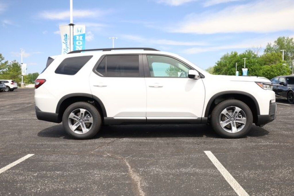 This Pilot is well equipped with AWD, 3rd row seats: split-bench, 4-Wheel Disc Brakes, 9 Speakers, ABS brakes, Adaptive Cruise Control: Adaptive Cruise Control (ACC) with Low-Speed Follow, Air Conditioning, Alloy wheels, Apple CarPlay/Android Auto, Auto High-beam Headlights, Auto-dimming Rear-View mirror, Automatic temperature control, Blind Spot Information (BSI) System warning, Brake assist, Bumpers: body-color, Compass, Delay-off headlights, Driver door bin, Driver vanity mirror, Dual front impact airbags, Dual front side impact airbags, Electronic Stability Control, Emergency communication system: HondaLink, Exterior Parking Camera Rear, Four wheel independent suspension, Front anti-roll bar, Front Bucket Seats, Front Center Armrest, Front dual zone A/C, Front fog lights, Front reading lights, Fully automatic headlights, Heated door mirrors, Heated Front Bucket Seats, Heated front seats, HondaLink, HondaLink Subscription Services, Illuminated entry, Knee airbag, Lane departure: Lane Keeping Assist System (LKAS) active, Leather-Trimmed Seat Trim with Fabric Accent, Low tire pressure warning, Memory seat, Navigation system: Google Maps, Occupant sensing airbag, Outside temperature display, Overhead airbag, Overhead console, Panic alarm, Passenger door bin, Passenger vanity mirror, Power door mirrors, Power driver seat, Power Liftgate, Power passenger seat, Power steering, Power windows, Radio data system, Radio: 245-Watt Audio System, Rear air conditioning, Rear anti-roll bar, Rear reading lights, Rear seat center armrest, Rear window defroster, Rear window wiper, Reclining 3rd row seat, Remote keyless entry, Security system, Speed control, Speed-sensing steering, Speed-Sensitive Wipers, Split folding rear seat, Spoiler, Steering wheel mounted audio controls, Tachometer, Telescoping steering wheel, Tilt steering wheel, Traction control, Trip computer, Turn signal indicator mirrors, Variably intermittent wipers, and Wheels: 18" Pewter Gray Machined Face.