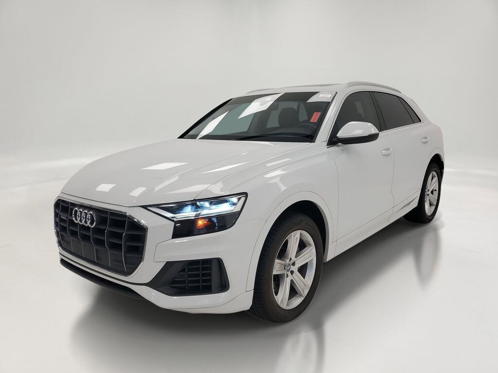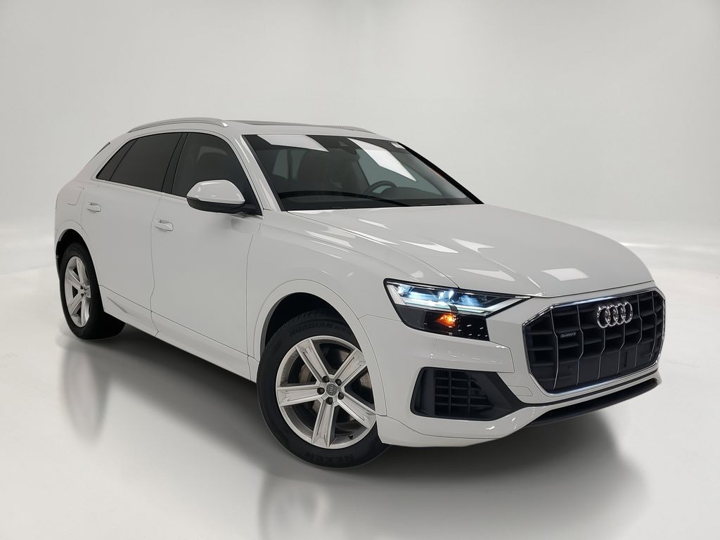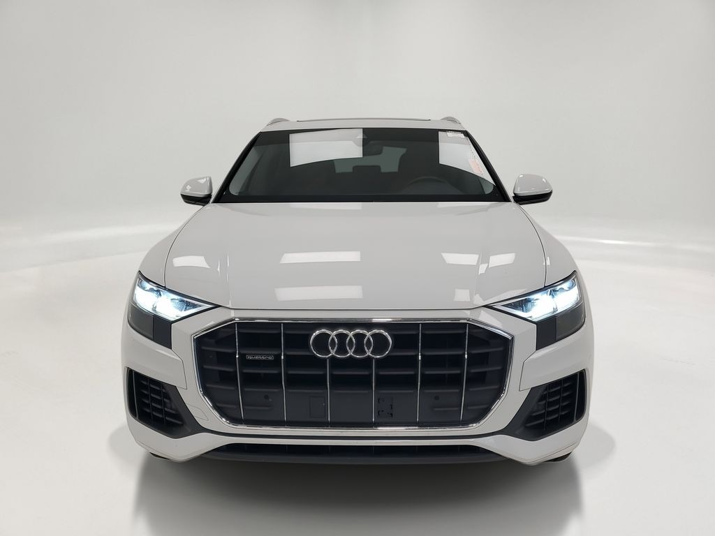 This Q8 is well equipped with Convenience Package (Audi Phone Box w/Wireless Charging, Audi Side Assist w/Pre Sense Rear, and Heated Power Folding Auto-Dimming Exterior Mirrors), Towing Package, Q8 3.0T Premium quattro, 4D Sport Utility, 3.0L V6 Turbocharged DOHC 24V LEV3-ULEV125 335hp, 8-Speed Automatic with Tiptronic, quattro, Glacier White, Saiga Beige Leather, 10 Speakers, 4-Wheel Disc Brakes, ABS brakes, Adaptive suspension, Air Conditioning, Alloy wheels, AM/FM radio: SiriusXM, Audi smartphone interface (Apple CarPlay/Android Auto), Auto-dimming Rear-View mirror, Automatic temperature control, Axle Ratio: TBA, Brake assist, Bumpers: body-color, Compass, Delay-off headlights, DELETE Front License Plate Holder, Driver door bin, Driver vanity mirror, Dual front impact airbags, Dual front side impact airbags, Electronic Stability Control, Emergency communication system: Audi connect CARE, Exterior Parking Camera Rear, Four wheel independent suspension, Front anti-roll bar, Front Bucket Seats, Front Center Armrest, Front dual zone A/C, Front fog lights, Front reading lights, Fully automatic headlights, Garage door transmitter: HomeLink, Genuine wood door panel insert, Heated door mirrors, Heated Front Bucket Seats, Heated front seats, Illuminated entry, Leather Seating Surfaces, Leather Shift Knob, Leather steering wheel, Low tire pressure warning, Memory seat, Navigation System, Occupant sensing airbag, Outside temperature display, Overhead airbag, Overhead console, Panic alarm, Passenger door bin, Passenger vanity mirror, Power door mirrors, Power driver seat, Power Liftgate, Power moonroof, Power passenger seat, Power steering, Power windows, Radio data system, Radio: Audi MMI Navigation Plus w/Touch Response, Rain sensing wipers, Rear air conditioning, Rear anti-roll bar, Rear fog lights, Rear reading lights, Rear seat center armrest, Rear window defroster, Rear window wiper, Remote keyless entry, Roof rack: rails only, Security system, Speed control, Speed-sensing steering, Split folding rear seat, Spoiler, Steering wheel memory, Steering wheel mounted audio controls, Tachometer, Telescoping steering wheel, Tilt steering wheel, Traction control, Trip computer, Turn signal indicator mirrors, Variably intermittent wipers, and Wheels: 20" 5-Spoke.