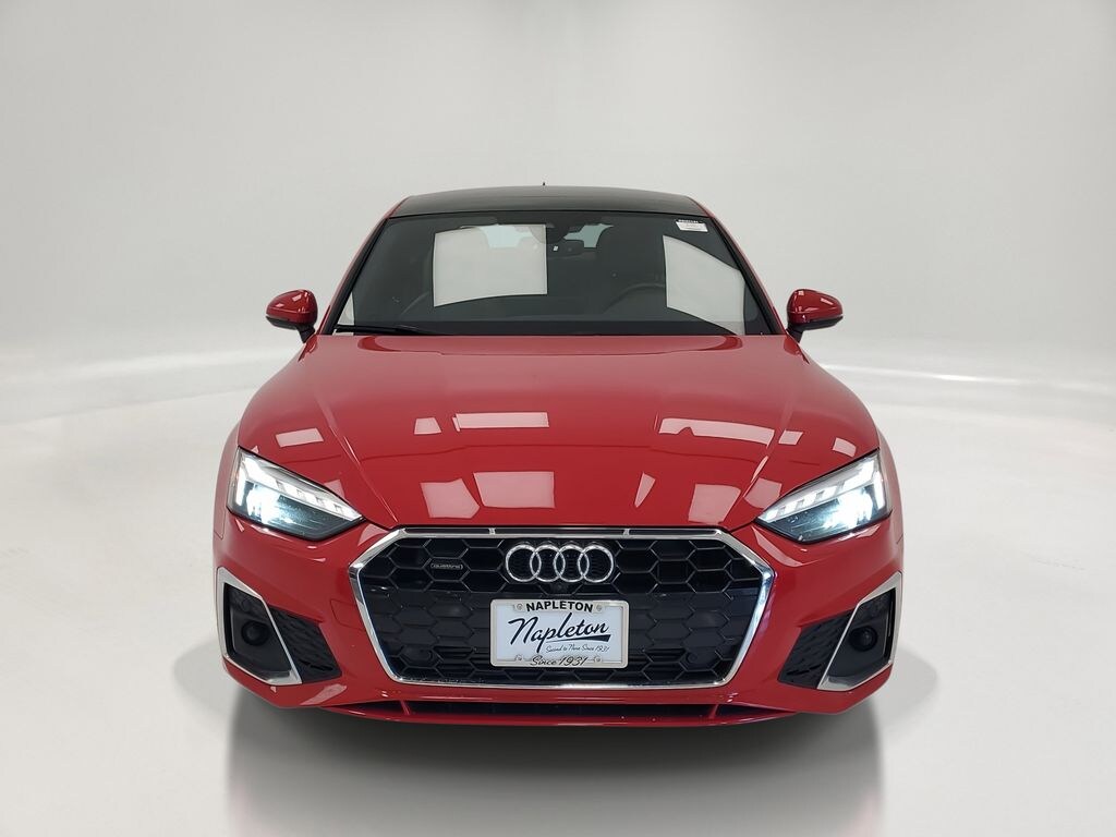 This A5 Sportback is well equipped with Convenience Package (Alarm System w/Motion Sensors, Audi Advanced Key, Audi Side Assist w/Pre Sense Rear, Auto-Dimming Exterior Mirrors w/Memory, Driver Seat Memory, and SiriusXM w/360L), A5 Sportback 45 S line Premium Plus quattro, 4D Hatchback, 2.0L 4-Cylinder TFSI, 7-Speed Automatic S tronic, quattro, Black w/Leather Seating Surfaces, 10 Speakers, 4-Wheel Disc Brakes, ABS brakes, Air Conditioning, Alloy wheels, AM/FM radio, Anti-whiplash front head restraints, Auto High-beam Headlights, Auto-dimming Rear-View mirror, Automatic temperature control, Brake assist, Bumpers: body-color, Compass, Delay-off headlights, Driver door bin, Driver vanity mirror, Dual front impact airbags, Dual front side impact airbags, Electronic Stability Control, Emergency communication system: Audi connect CARE, Exterior Parking Camera Rear, Four wheel independent suspension, Front anti-roll bar, Front Bucket Seats, Front Center Armrest, Front dual zone A/C, Front fog lights, Front reading lights, Garage door transmitter: HomeLink, Genuine wood console insert, Genuine wood dashboard insert, Genuine wood door panel insert, Heated door mirrors, Heated front seats, Heated Front Sport Seats, Heated steering wheel, Illuminated entry, Knee airbag, Leather Seating Surfaces, Leather Shift Knob, Leather steering wheel, Low tire pressure warning, Occupant sensing airbag, Outside temperature display, Overhead airbag, Overhead console, Panic alarm, Passenger door bin, Passenger vanity mirror, Power adjustable front head restraints, Power door mirrors, Power driver seat, Power Liftgate, Power moonroof, Power passenger seat, Power steering, Power windows, Radio data system, Radio: Audi Sound System, Rain sensing wipers, Rear air conditioning, Rear anti-roll bar, Rear reading lights, Rear seat center armrest, Rear window defroster, Remote keyless entry, Speed control, Speed-sensing steering, Speed-Sensitive Wipers, Split folding rear seat, Steering wheel mounted audio controls, Tachometer, Telescoping steering wheel, Tilt steering wheel, Traction control, Trip computer, Turn signal indicator mirrors, Variably intermittent wipers, and Wheels: 18" 5-Double-Spoke Design.