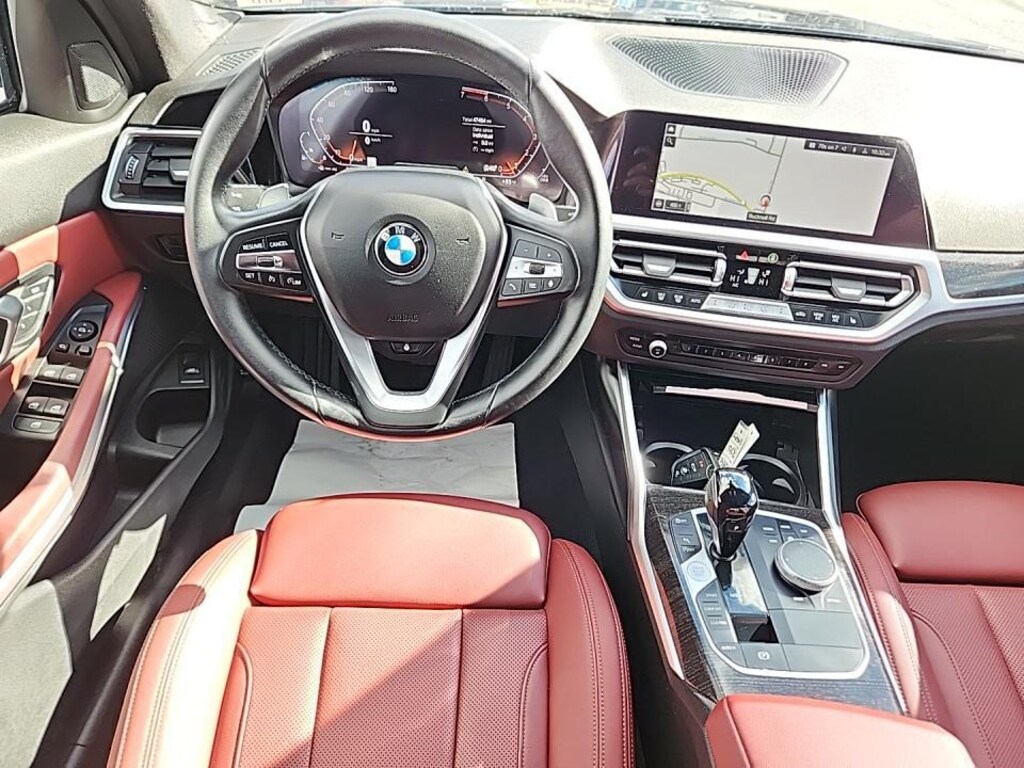 This 3 Series is well equipped with Connected Package Pro, Driving Assistance Package (Active Blind Spot Detection, Active Driving Assistant, Lane Departure Warning System, and Park Distance Control), Premium Package 2 (Comfort Access Keyless Entry, Gesture Control, Heated Front Seats, Heated Steering Wheel, and Lumbar Support), 330i xDrive, 4D Sedan, 2.0L 4-Cylinder DOHC 16V Turbocharged, 8-Speed Automatic Sport, AWD, Mineral Grey Metallic, Tacora Red Artificial Leather, Alloy wheels, Wheels: 19" x 8" Double-Spoke Bi-Color Orbit Grey, 10 Speakers, 4-Wheel Disc Brakes, ABS brakes, Air Conditioning, AM/FM radio: SiriusXM with 360L, Apple CarPlay & Android Auto Compatibility, Apple CarPlay Compatibility, Auto High-beam Headlights, Auto-dimming door mirrors, Auto-dimming Rear-View mirror, Automatic temperature control, BMW Assist eCall, BMW TeleServices, Brake assist, Bumpers: body-color, Compass, ConnectedDrive Services, Delay-off headlights, Driver door bin, Driver vanity mirror, Dual front impact airbags, Dual front side impact airbags, Electronic Stability Control, Emergency communication system: BMW Assist eCall, Enhanced Bluetooth, Exterior Parking Camera Rear, Four wheel independent suspension, Front anti-roll bar, Front Bucket Seats, Front Center Armrest, Front dual zone A/C, Front reading lights, Fully automatic headlights, Garage door transmitter, Genuine wood console insert, Genuine wood dashboard insert, Hands-Free Bluetooth & USB Audio Connection, Heated door mirrors, Hi-Fi Sound System, Illuminated entry, Knee airbag, Leather Shift Knob, Leather steering wheel, Live Cockpit Pro w/Navi, Low tire pressure warning, Memory seat, Navigation, Navigation System, Occupant sensing airbag, Outside temperature display, Overhead airbag, Panic alarm, Passenger door bin, Passenger vanity mirror, Perforated Sensatec Upholstery, Power door mirrors, Power driver seat, Power Front Seats, Power moonroof, Power passenger seat, Power steering, Power windows, Radio Control US, Radio data system, Radio: AM/FM Audio System, Rain sensing wipers, Rear air conditioning, Rear anti-roll bar, Rear reading lights, Rear seat center armrest, Rear window defroster, Remote Engine Start, Remote keyless entry, Security system, Shadowline Exterior Trim, SiriusXM w/360L, Speed control, Speed-sensing steering, Speed-Sensitive Wipers, Split folding rear seat, Sport Seats, Sport steering wheel, Steering wheel mounted audio controls, Tachometer, Telescoping steering wheel, Tilt steering wheel, Traction control, Trip computer, Turn signal indicator mirrors, and Variably intermittent wipers.