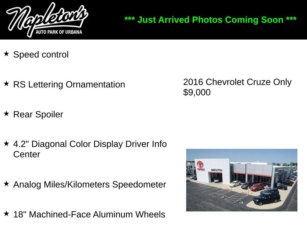Get used cars in Chicago at UsedCarsChicago.com. We have over 1000 vehicles in stock and ready to drive! We are Chicago's used car guide. This 2016 Chevrolet Cruze is only one of our massive inventory of used cars in the Chicago area.- We're here to help: (217) 367-1222
