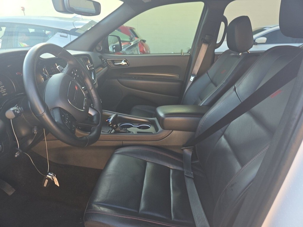 This Durango is well equipped with Blacktop Package (Gloss Black Badges, Gloss Black Exterior Mirrors, and Satin Black Dodge Tail Lamp Badge), Quick Order Package 22S R/T, AWD, 2nd Row Fold/Tumble Captain Chairs, 2nd Row Seat Mounted Inboard Armrests, Apple CarPlay/Android Auto, Heated front seats, Heated rear seats, Leather Suede Bucket Seats, Power Liftgate, Power Sunroof, 2nd Row Mini Console w/Cupholders, 3.09 Rear Axle Ratio, 3rd row seats: split-bench, 4-Wheel Disc Brakes, 6-Passenger Seating, 9 Speakers, ABS brakes, Air Conditioning, Alloy wheels, AM/FM radio: SiriusXM w/360L, Anti-whiplash front head restraints, Audio memory, Auto High-beam Headlights, Auto-dimming door mirrors, Auto-dimming Rear-View mirror, Auto-leveling suspension, Automatic temperature control, Brake assist, Bumpers: body-color, Compass, Delay-off headlights, Driver door bin, Driver vanity mirror, Dual front impact airbags, Dual front side impact airbags, Electronic Stability Control, Emergency communication system: SiriusXM Guardian, Four wheel independent suspension, Front anti-roll bar, Front Bucket Seats, Front Center Armrest w/Storage, Front dual zone A/C, Front fog lights, Front reading lights, Fully automatic headlights, Garage door transmitter, Heated door mirrors, Heated steering wheel, Heavy-Duty Engine Cooling, Illuminated entry, Knee airbag, Leather steering wheel, Low tire pressure warning, Memory seat, Mini Console 3rd Row Floor Mat, Navigation system: TomTom, Occupant sensing airbag, Outside temperature display, Overhead airbag, Overhead console, Panic alarm, ParkView Rear Back-Up Camera, Passenger door bin, Passenger vanity mirror, Power door mirrors, Power driver seat, Power passenger seat, Power steering, Power windows, Radio data system, Radio: Uconnect 5 Nav w/10.1" Display, Rain sensing wipers, Rear air conditioning, Rear anti-roll bar, Rear Load Leveling Suspension, Rear reading lights, Rear seat center armrest, Rear window defroster, Rear window wiper, Remote keyless entry, Security system, Speed control, Speed-sensing steering, Speed-Sensitive Wipers, Split folding rear seat, Spoiler, Steering wheel mounted audio controls, Tachometer, Telescoping steering wheel, Tilt steering wheel, Traction control, Trip computer, Turn signal indicator mirrors, Variably intermittent wipers, Voltmeter, Wheels: 20" x 8.0" Black Noise Aluminum, and Wheels: 20" x 8.0" Fine Silver.