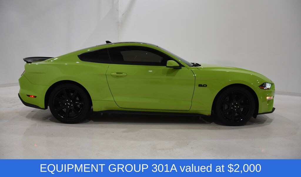 The Mustang GT's stunning green exterior is complemented by the Black Accent Package, which adds a touch of menacing style with black-painted aluminum wheels, badges, and a decklid spoiler. Step inside and you'll be greeted by a wealth of premium features, including the SYNC 3 infotainment system with an 8-inch touchscreen, dual-zone automatic climate control, and a premium 9-speaker audio system.