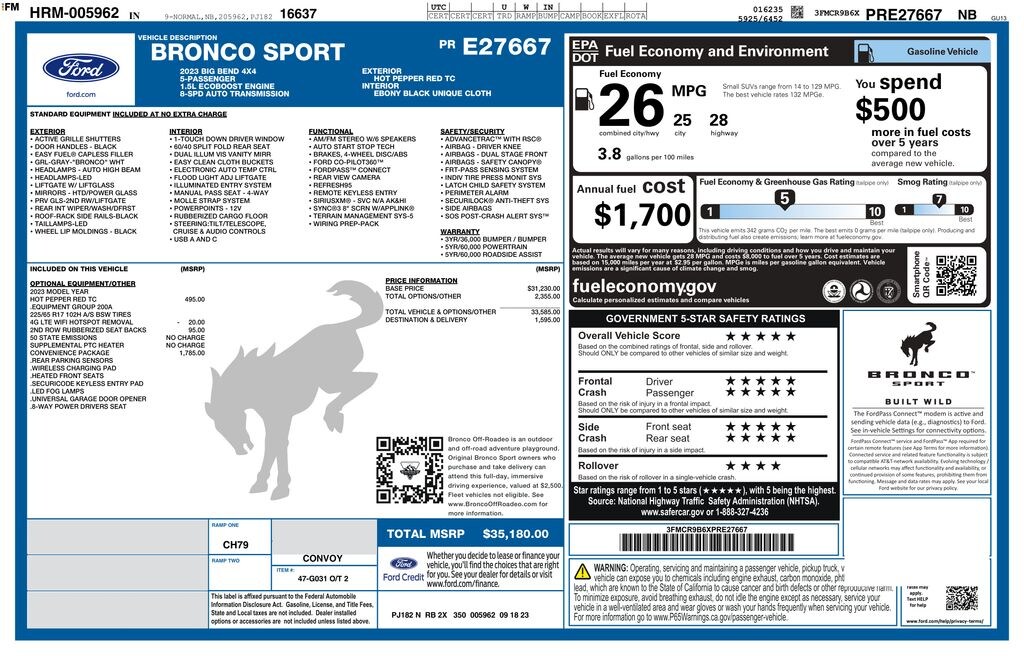 Powered by a 1.5L EcoBoost engine and equipped with 4-wheel drive, the Bronco Sport Big Bend delivers impressive performance and off-road capability. With an EPA-estimated 25 MPG in the city and 28 MPG on the highway, this SUV offers exceptional efficiency to handle your daily commute and weekend adventures.