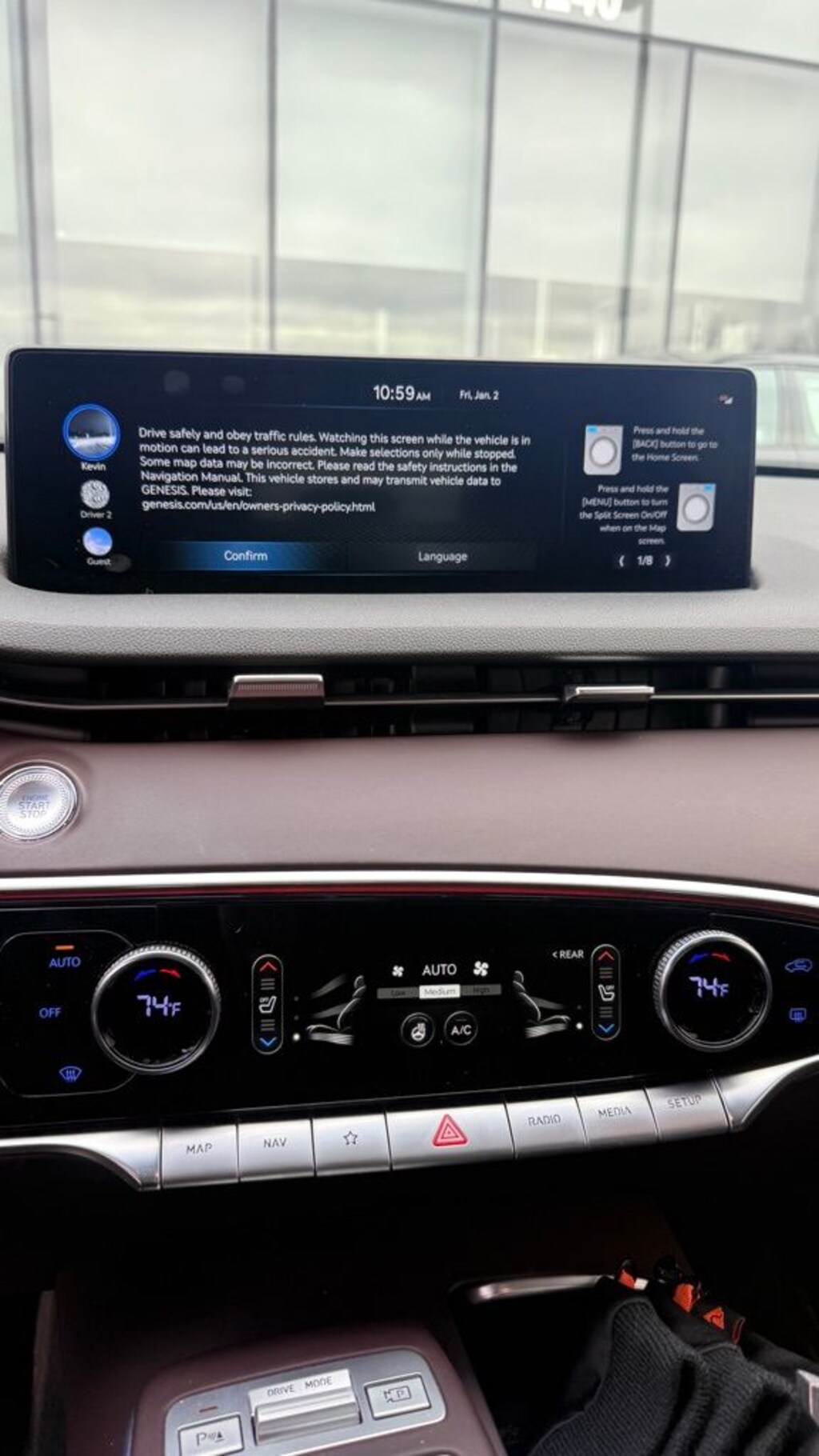 This GV70 is well equipped with Advanced Package (Heated Steering Wheel, Integrated Memory System (IMS), Monobloc Front Brakes, Option Group 02, Power Folding ECM Mirrors w/Genesis Logo Lamp, Power Telescoping Steering Wheel, Power Tilt & Slide Panoramic Sunroof, and Ventilated Front Seats), Select Package, Winter Weather Package (All Season Fitted Liners and Front & Rear Mudguards), Navigation System, 4-Wheel Disc Brakes, 4.181 Axle Ratio, 9 Speakers, ABS brakes, Air Conditioning, Alloy wheels, Aluminum Trim w/Spin Brushed Pattern, AM/FM radio: SiriusXM, Android Auto & Apple CarPlay, Anti-whiplash front head restraints, Auto High-beam Headlights, Auto-dimming Rear-View mirror, Automatic temperature control, Brake assist, Bumpers: body-color, Cargo Cover, Delay-off headlights, Driver door bin, Driver vanity mirror, Dual front impact airbags, Dual front side impact airbags, Electronic Stability Control, Emergency communication system, Exterior Parking Camera Rear, First Aid Kit, Four wheel independent suspension, Front anti-roll bar, Front Bucket Seats, Front Center Armrest w/Storage, Front dual zone A/C, Front reading lights, Fully automatic headlights, Garage door transmitter: HomeLink, Heated door mirrors, Heated Front Bucket Seats, Heated front seats, Illuminated Door Scuff Plates, Illuminated entry, Knee airbag, Leather Seating Surfaces, Leatherette Seating Surfaces, Low tire pressure warning, Occupant sensing airbag, Outside temperature display, Overhead airbag, Overhead console, Panic alarm, Passenger door bin, Passenger vanity mirror, Power door mirrors, Power driver seat, Power Liftgate, Power passenger seat, Power steering, Power windows, Radio: AM/FM/SiriusXM/HD Premium Audio System, Rain sensing wipers, Rear anti-roll bar, Rear Parking Sensors, Rear reading lights, Rear seat center armrest, Rear window defroster, Rear window wiper, Remote keyless entry, Reversible Cargo Tray, Security system, Speed control, Speed-sensing steering, Speed-Sensitive Wipers, Split folding rear seat, Spoiler, Steering wheel mounted audio controls, Tachometer, Telescoping steering wheel, Tilt steering wheel, Traction control, Trip computer, Turn signal indicator mirrors, Variably intermittent wipers, Wave Line Backlit Trim, Wheel Locks, Wheels: 18" Real Steel Gray Alloy, and Wheels: 19" Dark Hyper Silver Aluminum.