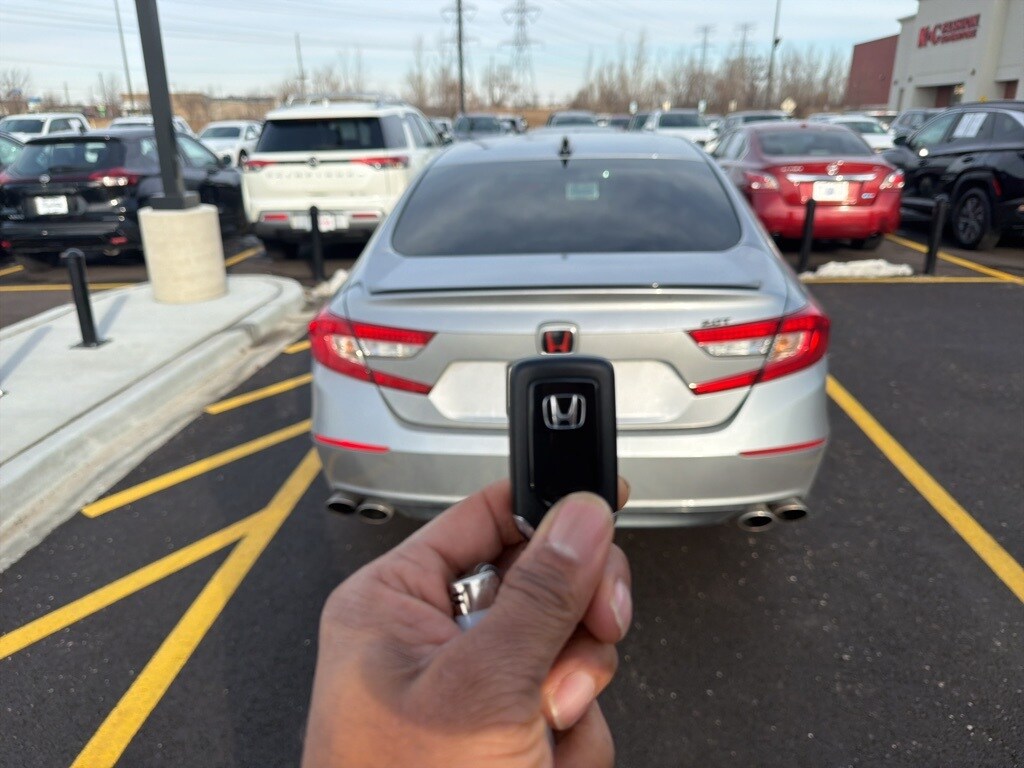 This Accord is well equipped with Accord Sport 2.0T, 4D Sedan, I4 DOHC 16V Turbocharged, 10-Speed Automatic, FWD, Silver, Black Cloth, 4-Wheel Disc Brakes, 8 Speakers, ABS brakes, Adaptive Cruise Control: Adaptive Cruise Control (ACC) with Low-Speed Follow, Air Conditioning, Alloy wheels, AM/FM radio: SiriusXM, Apple CarPlay/Android Auto, Auto High-beam Headlights, Automatic temperature control, Blind Spot Information (BSI) System warning, Brake assist, Bumpers: body-color, Cloth Seat Trim, Delay-off headlights, Driver door bin, Driver vanity mirror, Dual front impact airbags, Dual front side impact airbags, Electronic Stability Control, Emergency communication system: HondaLink, Exterior Parking Camera Rear, Forward collision: Collision Mitigation Braking System (CMBS) + FCW mitigation, Four wheel independent suspension, Front anti-roll bar, Front Bucket Seats, Front Center Armrest, Front dual zone A/C, Front fog lights, Front reading lights, Fully automatic headlights, Heated door mirrors, Heated Front Bucket Seats, Heated front seats, Illuminated entry, Knee airbag, Lane Departure Warning System, Leather steering wheel, Low tire pressure warning, Occupant sensing airbag, Outside temperature display, Overhead airbag, Overhead console, Panic alarm, Passenger door bin, Passenger vanity mirror, Power door mirrors, Power driver seat, Power moonroof, Power steering, Power windows, Radio data system, Radio: 180-Watt AM/FM/HD/SiriusXM Audio System, Rear anti-roll bar, Rear seat center armrest, Rear window defroster, Remote keyless entry, Security system, Speed control, Speed-sensing steering, Speed-Sensitive Wipers, Split folding rear seat, Spoiler, Steering wheel mounted audio controls, Tachometer, Telescoping steering wheel, Tilt steering wheel, Traction control, Trip computer, Variably intermittent wipers, and Wheels: 19" Machine-Finished Alloy w/Black Inserts.