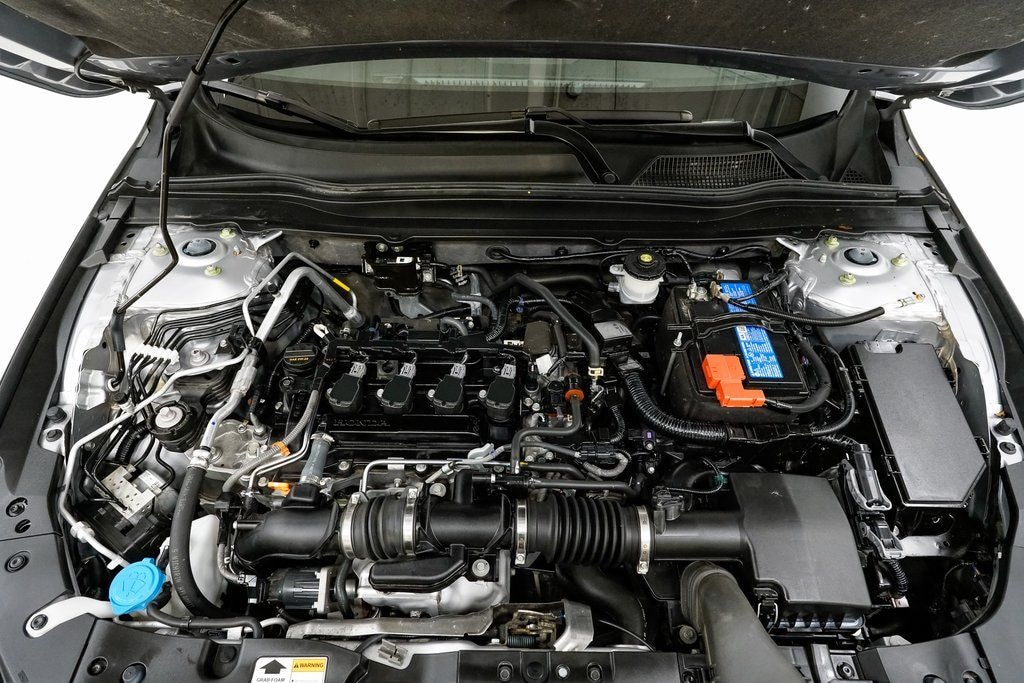 This Accord is well equipped with Black w/Fabric w/Synthetic Leather Seat Trim, Adaptive Cruise Control: Adaptive Cruise Control (ACC) with Low-Speed Follow, Forward collision: Collision Mitigation Braking System (CMBS) + FCW mitigation, Lane Departure Warning System, Radio: 180-Watt AM/FM Audio System, 4-Wheel Disc Brakes, 8 Speakers, ABS brakes, Air Conditioning, Alloy wheels, AM/FM radio, Apple CarPlay/Android Auto, Auto High-beam Headlights, Automatic temperature control, Brake assist, Bumpers: body-color, Delay-off headlights, Driver door bin, Driver vanity mirror, Dual front impact airbags, Dual front side impact airbags, Electronic Stability Control, Emergency communication system: HondaLink, Exterior Parking Camera Rear, Fabric w/Synthetic Leather Seat Trim, Four wheel independent suspension, Front anti-roll bar, Front Bucket Seats, Front Center Armrest, Front dual zone A/C, Front fog lights, Front reading lights, Fully automatic headlights, Illuminated entry, Knee airbag, Leather Shift Knob, Leather steering wheel, Low tire pressure warning, Occupant sensing airbag, Outside temperature display, Overhead airbag, Overhead console, Panic alarm, Passenger door bin, Passenger vanity mirror, Power door mirrors, Power driver seat, Power steering, Power windows, Radio data system, Rear anti-roll bar, Rear seat center armrest, Rear window defroster, Remote keyless entry, Security system, Speed control, Speed-sensing steering, Speed-Sensitive Wipers, Split folding rear seat, Spoiler, Steering wheel mounted audio controls, Tachometer, Telescoping steering wheel, Tilt steering wheel, Traction control, Trip computer, Variably intermittent wipers, and Wheels: 19" Machine-Finished Alloy w/Black Inserts.