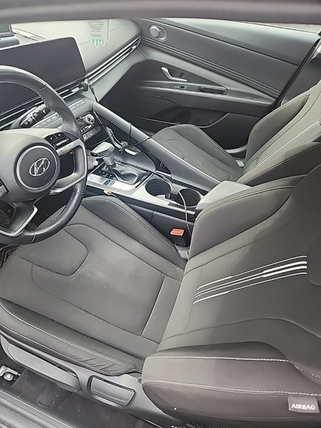 This Elantra is well equipped with Convenience Package (2nd Row USB Charge Port, Electronic Parking Brake, Forward Collision Avoidance Assist, Full 10.25" LCD TFT Cluster, Heated Front Seats, Heated Outside Mirrors, Leather-Wrapped Steering Wheel, LED Interior Lights, Option Group 02, Radio: AM/FM/HD/SiriusXM Audio System, Smart Cruise Control w/Stop & Go, Wheels: 17" x 7.0J Machine Finish Alloy, and Wireless Charging Pad), 16" x 6.5J Alloy Wheels, 4-Wheel Disc Brakes, 6 Speakers, ABS brakes, Air Conditioning, Alloy wheels, AM/FM radio: SiriusXM, Apple CarPlay & Android Auto, Auto High-beam Headlights, Automatic temperature control, Brake assist, Bumpers: body-color, Carpeted Floor Mats, Cloth Seat Trim, Delay-off headlights, Driver door bin, Driver vanity mirror, Dual front impact airbags, Dual front side impact airbags, Electronic Stability Control, Emergency communication system: Blue Link Connected Car Service (3-year complimentary subscription), Exterior Parking Camera Rear, First Aid Kit, Front anti-roll bar, Front Bucket Seats, Front Center Armrest, Front dual zone A/C, Front reading lights, Front wheel independent suspension, Fully automatic headlights, Illuminated entry, Low tire pressure warning, Occupant sensing airbag, Outside temperature display, Overhead airbag, Overhead console, Panic alarm, Passenger door bin, Passenger vanity mirror, Power door mirrors, Power steering, Power windows, Radio: AM/FM/HD/SiriusXM Display Audio, Rear Bumper Applique, Rear window defroster, Remote keyless entry, Reversible Cargo Tray, Security system, Speed control, Speed-sensing steering, Steering wheel mounted audio controls, Tachometer, Telescoping steering wheel, Tilt steering wheel, Traction control, Trip computer, and Variably intermittent wipers.