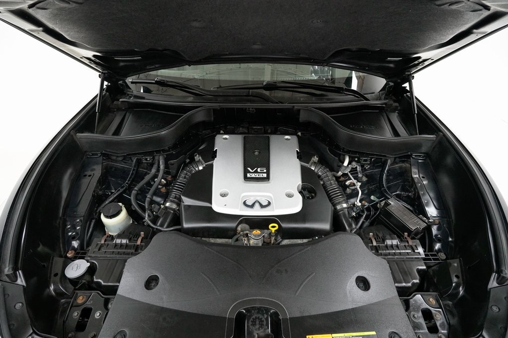 This QX70 is well equipped with 11 Speakers, 18" 5-Spoke Aluminum Alloy Wheels, 3.692 Axle Ratio, 4-Wheel Disc Brakes, ABS brakes, Air Conditioning, Alloy wheels, AM/FM radio: SiriusXM, Anti-whiplash front head restraints, Auto-dimming Rear-View mirror, Automatic temperature control, Block heater, Bodyside moldings, Brake assist, Bumpers: body-color, CD player, Compass, Delay-off headlights, Driver door bin, Driver vanity mirror, Dual front impact airbags, Dual front side impact airbags, Electronic Stability Control, Four wheel independent suspension, Front anti-roll bar, Front Bucket Seats, Front Center Armrest w/Storage, Front dual zone A/C, Front fog lights, Front reading lights, Fully automatic headlights, Garage door transmitter: HomeLink, Heated door mirrors, Heated Front Bucket Seats, Heated front seats, High intensity discharge headlights: Bi-Xenon, Illuminated entry, Leather Shift Knob, Leather steering wheel, Leather-Appointed Seat Trim, Low tire pressure warning, MP3 decoder, Occupant sensing airbag, Outside temperature display, Overhead airbag, Overhead console, Panic alarm, Passenger door bin, Passenger vanity mirror, Power door mirrors, Power driver seat, Power Liftgate, Power moonroof, Power passenger seat, Power steering, Power windows, Radio data system, Radio: AM/FM/CD/MP3 Playback Capability, Rear anti-roll bar, Rear reading lights, Rear seat center armrest, Rear window defroster, Rear window wiper, Remote keyless entry, Security system, Speed control, Speed-sensing steering, Speed-Sensitive Wipers, Split folding rear seat, Spoiler, Steering wheel mounted audio controls, Tachometer, Telescoping steering wheel, Tilt steering wheel, Traction control, Trip computer, and Variably intermittent wipers.