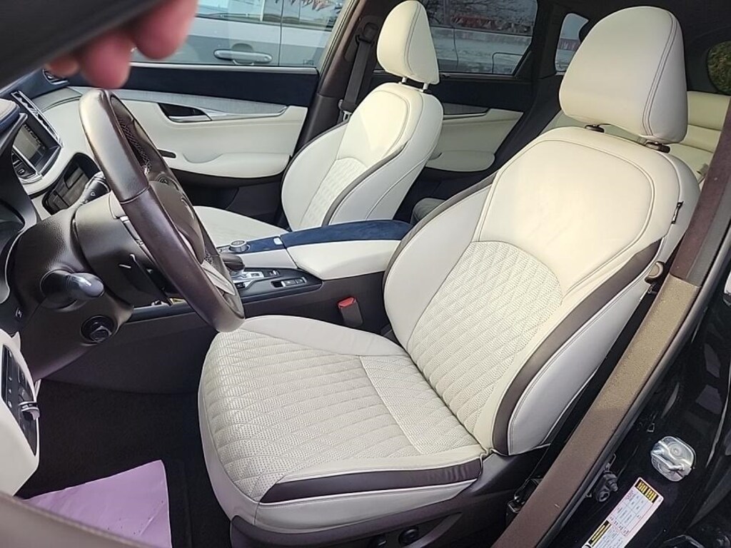 This QX50 is well equipped with Cargo Package, Tow Hitch Package w/Motion Activated Liftgate, QX50 Autograph, 4D Sport Utility, I4, CVT, AWD, Black Metallic, White Leather, Navigation system: INFINITI InTouch Navigation, 16 Speakers, 4-Wheel Disc Brakes, 5.846 Axle Ratio, ABS brakes, Air Conditioning, Alloy wheels, AM/FM radio: SiriusXM, Anti-whiplash front head restraints, Auto High-beam Headlights, Auto tilt-away steering wheel, Auto-dimming Rear-View mirror, Automatic temperature control, Black Splash Guards (Set of 4), Brake assist, Bumpers: body-color, CD player, Climate Controlled Front Bucket Seats, Delay-off headlights, Driver door bin, Driver vanity mirror, Dual front impact airbags, Dual front side impact airbags, Electronic Stability Control, Emergency communication system: INFINITI InTouch, Floor Mats, Four wheel independent suspension, Front anti-roll bar, Front Bucket Seats, Front Center Armrest, Front dual zone A/C, Front fog lights, Front reading lights, Fully automatic headlights, Garage door transmitter: HomeLink, Genuine wood door panel insert, Heads-Up Display, Heated door mirrors, Heated front seats, Heated rear seats, Heated steering wheel, Illuminated entry, Illuminated Kick Plates, Knee airbag, Leather Shift Knob, Low tire pressure warning, Memory seat, Occupant sensing airbag, Outside temperature display, Overhead airbag, Overhead console, Panic alarm, Passenger door bin, Passenger vanity mirror, Power door mirrors, Power driver seat, Power Liftgate, Power moonroof, Power passenger seat, Power steering, Power windows, Premium audio system: Bose, Radio data system, Radio: Bose Performance Series Audio System, Rain sensing wipers, Rear air conditioning, Rear anti-roll bar, Rear Bumper Protector, Rear reading lights, Rear seat center armrest, Rear side impact airbag, Rear window defroster, Rear window wiper, Remote keyless entry, Security system, Semi-Aniline Leather-Appointed Seat Trim, Speed control, Speed-sensing steering, Speed-Sensitive Wipers, Split folding rear seat, Spoiler, Steering wheel memory, Steering wheel mounted audio controls, Tachometer, Telescoping steering wheel, Tilt steering wheel, Traction control, Trip computer, Turn signal indicator mirrors, Variably intermittent wipers, Ventilated front seats, and Wheels: 20" Dark Painted.
