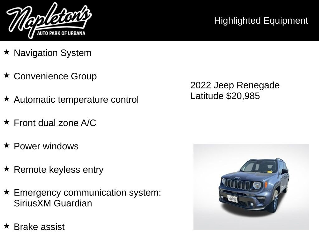 Experience the perfect balance of style, capability, and convenience with the 2022 Jeep Renegade Latitude Convenience Group. Visit our showroom today and let us help you discover the perfect SUV to elevate your driving experience.