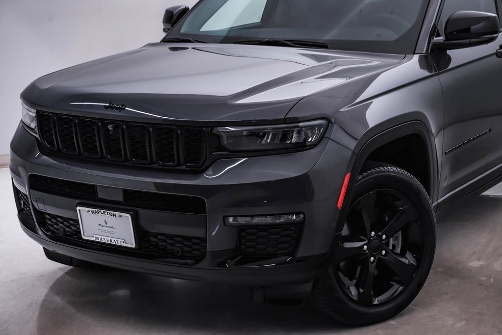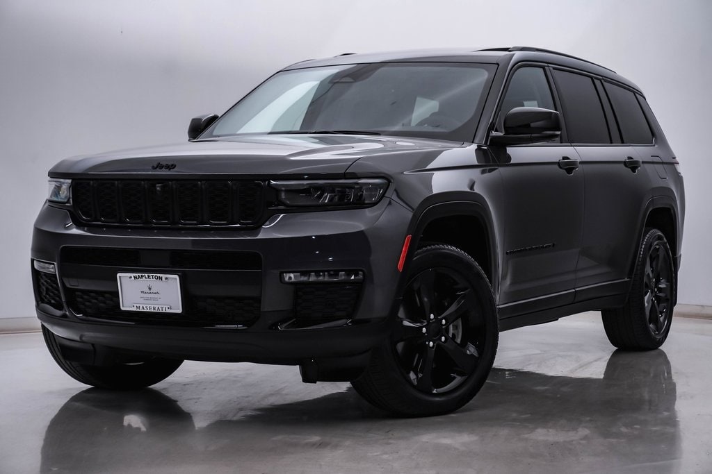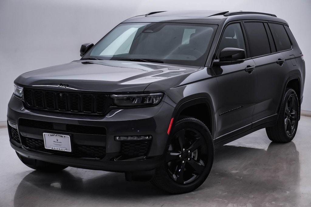 This Grand Cherokee L is well equipped with Black Appearance Package (Gloss Black Exterior Accents, Molded In Color Black/Gloss Black Roof Rails, and Wheels: 20" x 8.5" Gloss Black Painted Aluminum), Luxury Tech Group II (2nd Row Manual Window Shades, Auto-Dimming Exterior Driver Mirror, Capri Leatherette w/Axis II Seats, Integrated Off-Road Camera, Intersection Collision Assist System, Memory Steering Column, ParkSense Front/Rear Park Assist w/Stop, Passive Entry - Front/Rear Doors, Liftgate, Power Tilt/Telescope Steering Column, Rain Sensitive Windshield Wipers, Rear Back Up Camera Washer, Rearview Autodim Digital Display Mirror, Surround View Camera System, Ventilated Front Seats, and Wireless Charging Pad), MOPAR Finishing Package (MOPAR Front Splash Guards, MOPAR Paint Protection Film, and MOPAR Rear Splash Guards w/Jeep Logo), Quick Order Package 23E, Trailer Tow Group (B) (DISC) (220 Amp Alternator, Automatic Headlamp Leveling System, Heavy-Duty Engine Cooling, Rear Load Leveling Suspension, and Trailer Hitch Zoom), 2nd Row 60/40 Bench w/Manual Tip/Slide, 2nd Row Seat Center Armrest/Cupholders, 3 Rear Seat Head Restraints, 3.45 Rear Axle Ratio, 3rd row seats: split-bench, 4-Wheel Disc Brakes, 506 Watt Amplifier, 6 Speakers, 7-Passenger Seating, 9 Amplified Speakers w/Subwoofer, ABS brakes, Active Noise Control System, Air Conditioning, Alloy wheels, AM/FM radio: SiriusXM with 360L, Anti-whiplash front head restraints, Audio memory, Auto High-beam Headlights, Automatic temperature control, Brake assist, Bumpers: body-color, Capri Leatherette Seats, Center Rear 3-Point Seat Belt, Compass, Delay-off headlights, Driver door bin, Driver vanity mirror, Dual front impact airbags, Dual front side impact airbags, Dual-Pane Panoramic Sunroof, Electronic Stability Control, Emergency communication system, Four wheel independent suspension, Front anti-roll bar, Front Bucket Seats, Front Center Armrest w/Storage, Front dual zone A/C, Front fog lights, Front License Plate Bracket, Front reading lights, Fully automatic headlights, Garage door transmitter, Heated door mirrors, Heated front seats, Heated rear seats, Heated steering wheel, Illuminated entry, Interior Rear Facing Camera, Knee airbag, Low tire pressure warning, Manual Fold Seatbacks, Memory seat, Navigation System, Normal Duty Suspension, Occupant sensing airbag, Outside temperature display, Overhead airbag, Overhead console, Panic alarm, ParkView Rear Back-Up Camera, Passenger door bin, Passenger vanity mirror, Power door mirrors, Power driver seat, Power Liftgate, Power passenger seat, Power steering, Power windows, Radio data system, Radio: Uconnect 5 Nav w/10.1" Display, Rear air conditioning, Rear anti-roll bar, Rear reading lights, Rear window defroster, Rear window wiper, Reclining 3rd row seat, Remote keyless entry, Security system, Speed control, Speed-Sensitive Wipers, Split folding rear seat, Spoiler, Steering wheel mounted audio controls, Tachometer, Telescoping steering wheel, Tilt steering wheel, Traction control, Trip computer, Turn signal indicator mirrors, Variably intermittent wipers, Voltmeter, and Wheels: 18" x 8.0" Fully Paint