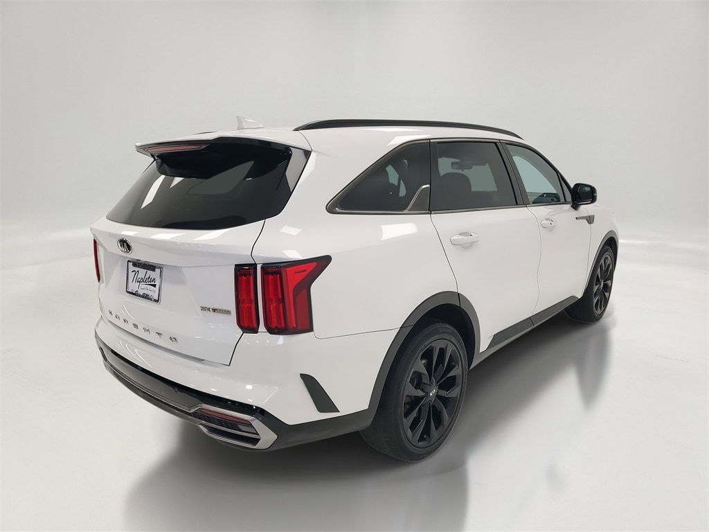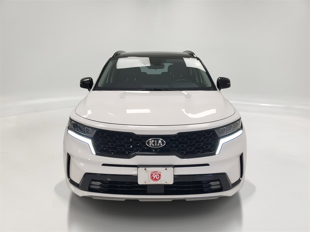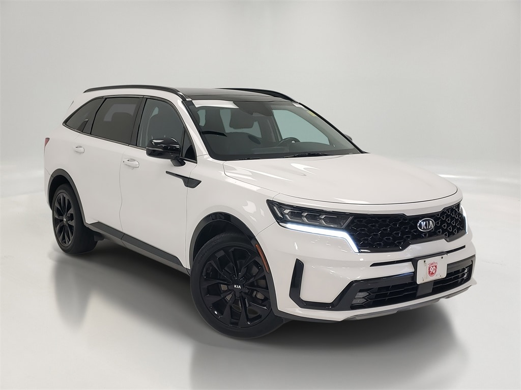 This Sorento is well equipped with Sorento SX, 4D Sport Utility, 2.5L I4 DGI Turbocharged DOHC 16V LEV3-ULEV70 281hp, 8-Speed DCT, FWD, Glacial White Pearl, Black Artificial Leather, Navigation System, 3.316 Axle Ratio, 3rd row seats: split-bench, 4-Wheel Disc Brakes, 6 Speakers, ABS brakes, Air Conditioning, Alloy wheels, AM/FM radio: SiriusXM, Apple CarPlay & Android Auto, Auto High-beam Headlights, Automatic temperature control, Brake assist, Bumpers: body-color, Carpeted Floor Mats, Delay-off headlights, Driver door bin, Driver vanity mirror, Dual front impact airbags, Dual front side impact airbags, Electronic Stability Control, Emergency communication system: UVO link, Exterior Parking Camera Rear, Four wheel independent suspension, Front anti-roll bar, Front Bucket Seats, Front Center Armrest, Front dual zone A/C, Front fog lights, Front reading lights, Fully automatic headlights, Heated door mirrors, Heated Front Bucket Seats, Heated front seats, Illuminated entry, Knee airbag, Leather steering wheel, Low tire pressure warning, Occupant sensing airbag, Outside temperature display, Overhead airbag, Overhead console, Panic alarm, Passenger door bin, Passenger vanity mirror, Power door mirrors, Power driver seat, Power Liftgate, Power moonroof, Power passenger seat, Power steering, Power windows, Premium Leatherette Seat Trim, Radio data system, Radio: AM/FM Audio System w/Navigation, Rear air conditioning, Rear anti-roll bar, Rear reading lights, Rear window defroster, Rear window wiper, Remote keyless entry, Roof rack: rails only, Security system, Smart Key w/ Push Button and Remote Start, Speed control, Speed-sensing steering, Split folding rear seat, Spoiler, Steering wheel mounted audio controls, Tachometer, Telescoping steering wheel, Tilt steering wheel, Traction control, Trip computer, Turn signal indicator mirrors, Variably intermittent wipers, and Wheels: 20" Gloss Black Alloy.