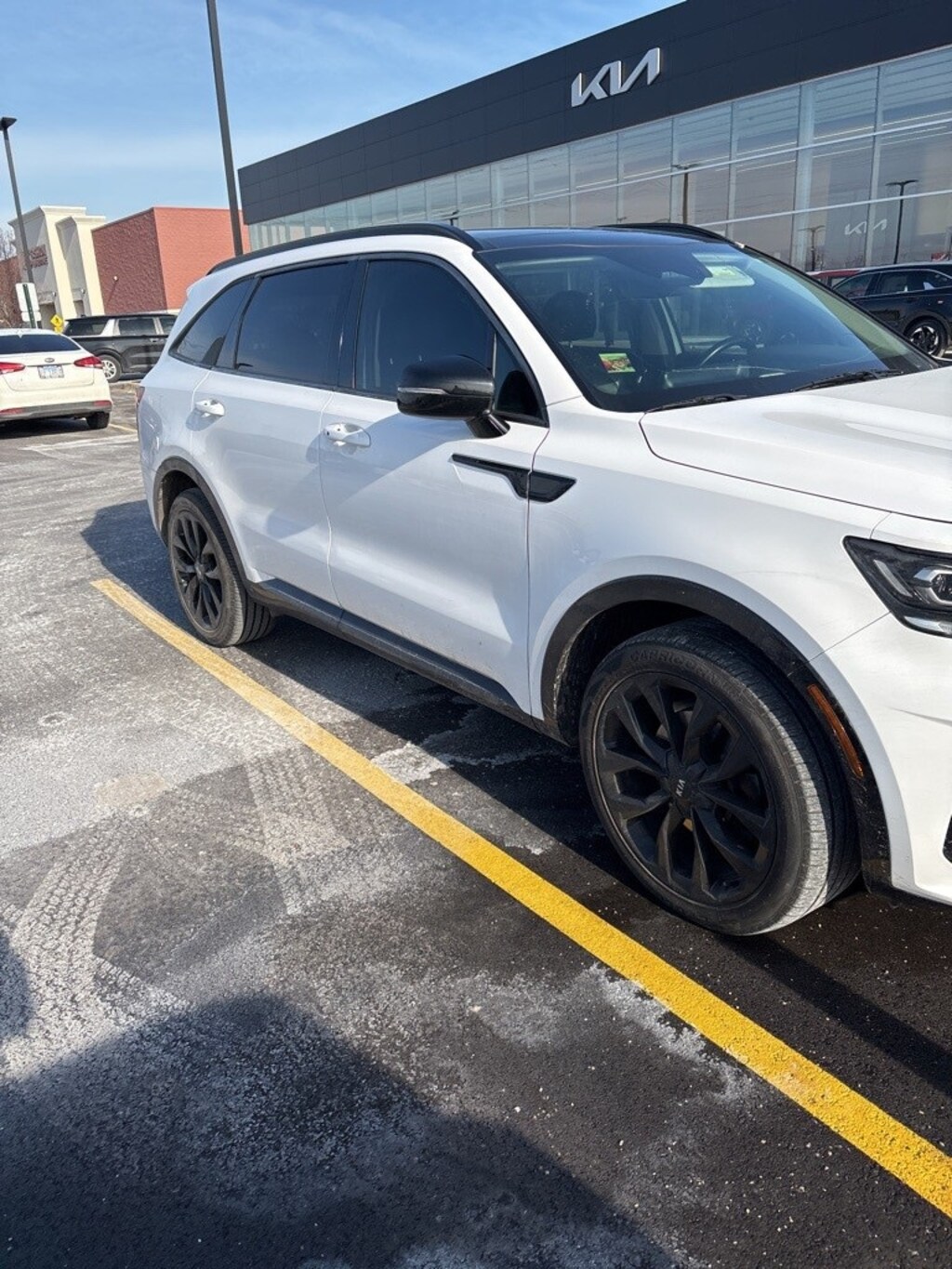 This Sorento is well equipped with Sorento SX, 4D Sport Utility, 2.5L I4 DGI Turbocharged DOHC 16V LEV3-ULEV70 281hp, 8-Speed DCT, FWD, Glacial White Pearl, Black Artificial Leather, 3.316 Axle Ratio, 3rd row seats: split-bench, 4-Wheel Disc Brakes, 6 Speakers, ABS brakes, Air Conditioning, Alloy wheels, AM/FM radio: SiriusXM, Apple CarPlay & Android Auto, Auto High-beam Headlights, Automatic temperature control, Brake assist, Bumpers: body-color, Carpeted Floor Mats, Delay-off headlights, Driver door bin, Driver vanity mirror, Dual front impact airbags, Dual front side impact airbags, Electronic Stability Control, Emergency communication system: UVO link, Exterior Parking Camera Rear, Four wheel independent suspension, Front anti-roll bar, Front Bucket Seats, Front Center Armrest, Front dual zone A/C, Front fog lights, Front reading lights, Fully automatic headlights, Heated door mirrors, Heated Front Bucket Seats, Heated front seats, Illuminated entry, Knee airbag, Leather steering wheel, Low tire pressure warning, Navigation System, Occupant sensing airbag, Outside temperature display, Overhead airbag, Overhead console, Panic alarm, Passenger door bin, Passenger vanity mirror, Power door mirrors, Power driver seat, Power Liftgate, Power moonroof, Power passenger seat, Power steering, Power windows, Premium Leatherette Seat Trim, Radio data system, Radio: AM/FM Audio System w/Navigation, Rear air conditioning, Rear anti-roll bar, Rear reading lights, Rear window defroster, Rear window wiper, Remote keyless entry, Roof rack: rails only, Security system, Smart Key w/ Push Button and Remote Start, Speed control, Speed-sensing steering, Split folding rear seat, Spoiler, Steering wheel mounted audio controls, Tachometer, Telescoping steering wheel, Tilt steering wheel, Traction control, Trip computer, Turn signal indicator mirrors, Variably intermittent wipers, and Wheels: 20" Gloss Black Alloy.