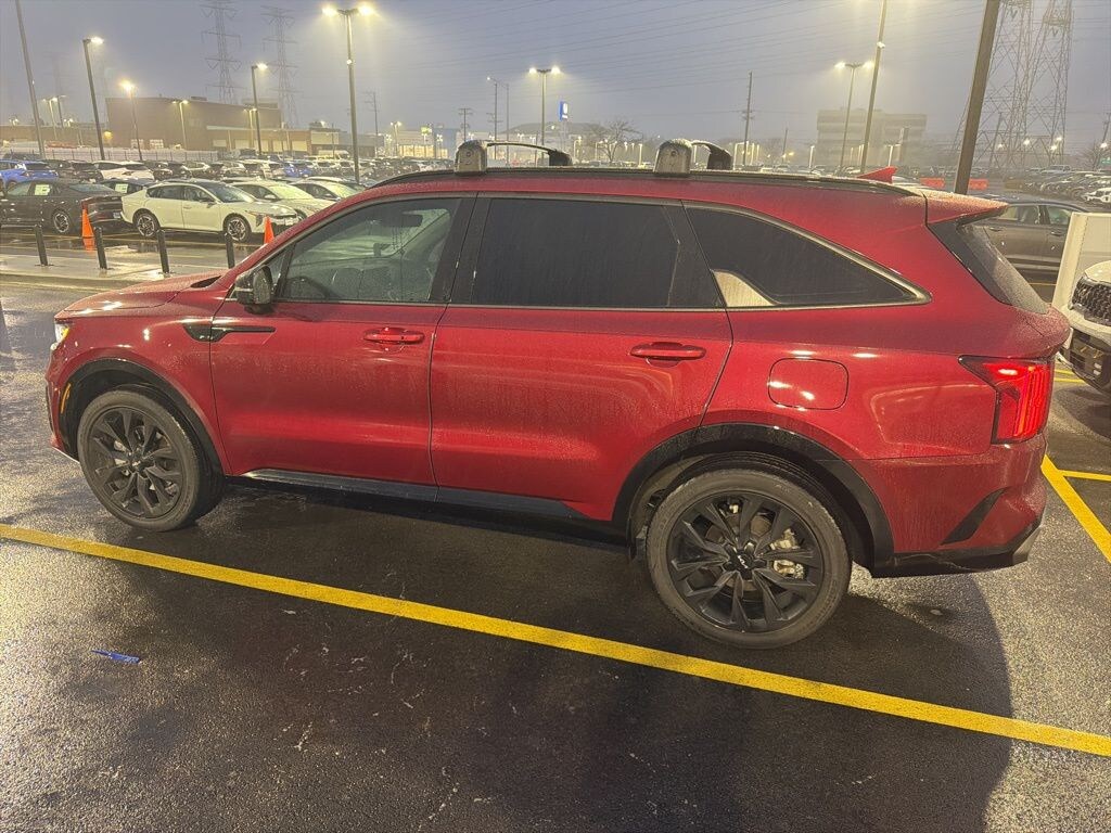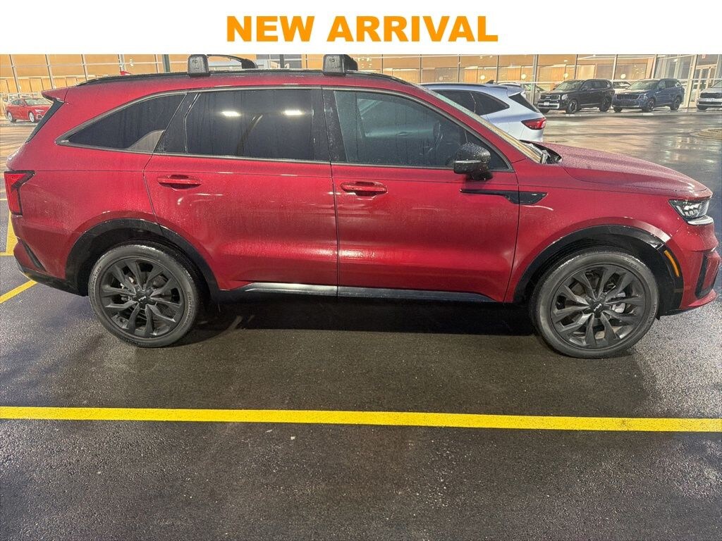 This Sorento is well equipped with Sorento SX, 4D Sport Utility, 2.5L I4 DGI Turbocharged DOHC 16V LEV3-ULEV70 281hp, 8-Speed DCT, AWD, Passion Red Tintcoat, Black Artificial Leather, 3.316 Axle Ratio, 3rd row seats: split-bench, 4-Wheel Disc Brakes, 6 Speakers, ABS brakes, Air Conditioning, Alloy wheels, AM/FM radio: SiriusXM, Apple CarPlay & Android Auto, Auto High-beam Headlights, Auto-dimming Rear-View mirror, Automatic temperature control, Brake assist, Bumpers: body-color, Cargo Cover, Carpet Floor Mats, Cross Bars, Delay-off headlights, Driver door bin, Driver vanity mirror, Dual front impact airbags, Dual front side impact airbags, Electronic Stability Control, Emergency communication system, Exterior Parking Camera Rear, Four wheel independent suspension, Front anti-roll bar, Front Bucket Seats, Front Center Armrest, Front dual zone A/C, Front fog lights, Front reading lights, Fully automatic headlights, Heated door mirrors, Heated Front Bucket Seats, Heated front seats, Illuminated entry, Interior Lighting Kit, Knee airbag, Leather steering wheel, Low tire pressure warning, Navigation System, Occupant sensing airbag, Outside temperature display, Overhead airbag, Overhead console, Panic alarm, Passenger door bin, Passenger vanity mirror, Power door mirrors, Power driver seat, Power Liftgate, Power moonroof, Power passenger seat, Power steering, Power windows, Radio data system, Radio: AM/FM Audio System, Rain sensing wipers, Rear air conditioning, Rear anti-roll bar, Rear reading lights, Rear window defroster, Rear window wiper, Remote keyless entry, Roof rack: rails only, Security system, Smart Key w/ Push Button and Remote Start, Speed control, Speed-sensing steering, Split folding rear seat, Spoiler, Steering wheel mounted audio controls, SynTex Artificial Leather Seat Trim, Tachometer, Telescoping steering wheel, Tilt steering wheel, Traction control, Trip computer, Turn signal indicator mirrors, Variably intermittent wipers, Wheel Locks, and Wheels: 8.5J x 20" Gloss Black Alloy.