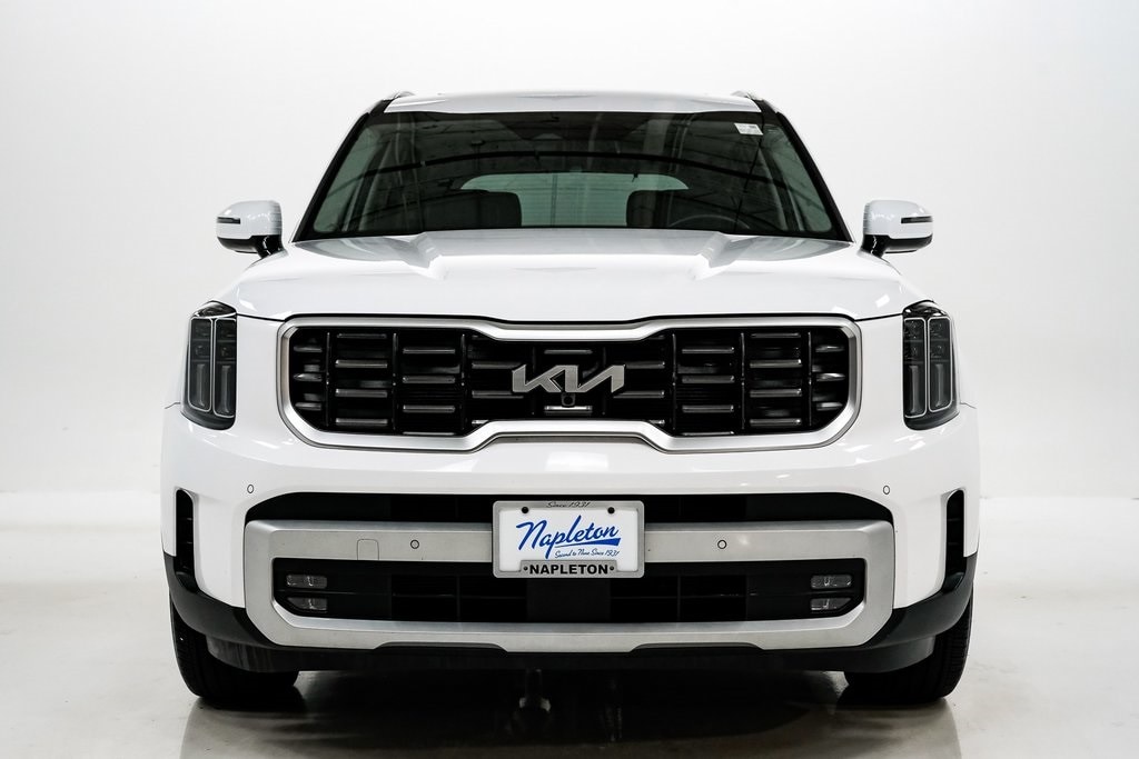 This Telluride is well equipped with 10 Speakers, 3.648 Axle Ratio, 3rd row seats: split-bench, 4-Wheel Disc Brakes, ABS brakes, Air Conditioning, Alloy wheels, AM/FM radio: SiriusXM, Apple CarPlay & Android Auto, Auto High-beam Headlights, Auto-dimming Rear-View mirror, Automatic temperature control, Brake assist, Bumpers: body-color, Carpet Floor Mats, Compass, Delay-off headlights, Driver door bin, Driver vanity mirror, Dual front impact airbags, Dual front side impact airbags, Electronic Stability Control, Emergency communication system: 911 Connect, Exterior Parking Camera Rear, Four wheel independent suspension, Front anti-roll bar, Front Bucket Seats, Front Center Armrest, Front dual zone A/C, Front fog lights, Front reading lights, Fully automatic headlights, Garage door transmitter: HomeLink, harman/kardon® Speakers, Heated & Ventilated Front Bucket Seats, Heated door mirrors, Heated front seats, Heated steering wheel, Illuminated entry, Knee airbag, Leather Seat Trim, Leather Shift Knob, Leather steering wheel, Low tire pressure warning, Memory seat, Navigation System, Occupant sensing airbag, Outside temperature display, Overhead airbag, Overhead console, Panic alarm, Passenger door bin, Passenger vanity mirror, Power door mirrors, Power driver seat, Power Liftgate, Power moonroof, Power passenger seat, Power steering, Power windows, Radio data system, Radio: AM/FM Harman Kardon Audio System, Rear air conditioning, Rear anti-roll bar, Rear audio controls, Rear reading lights, Rear side impact airbag, Rear window defroster, Rear window wiper, Reclining 3rd row seat, Remote keyless entry, Roof rack: rails only, Security system, Smart Key w/ Push Button and Remote Start, Speed control, Speed-sensing steering, Split folding rear seat, Spoiler, Steering wheel mounted audio controls, Tachometer, Telescoping steering wheel, Tilt steering wheel, Traction control, Trip computer, Turn signal indicator mirrors, Variably intermittent wipers, Ventilated front seats, and Wheels: 20" x 7.5" Black Finish.