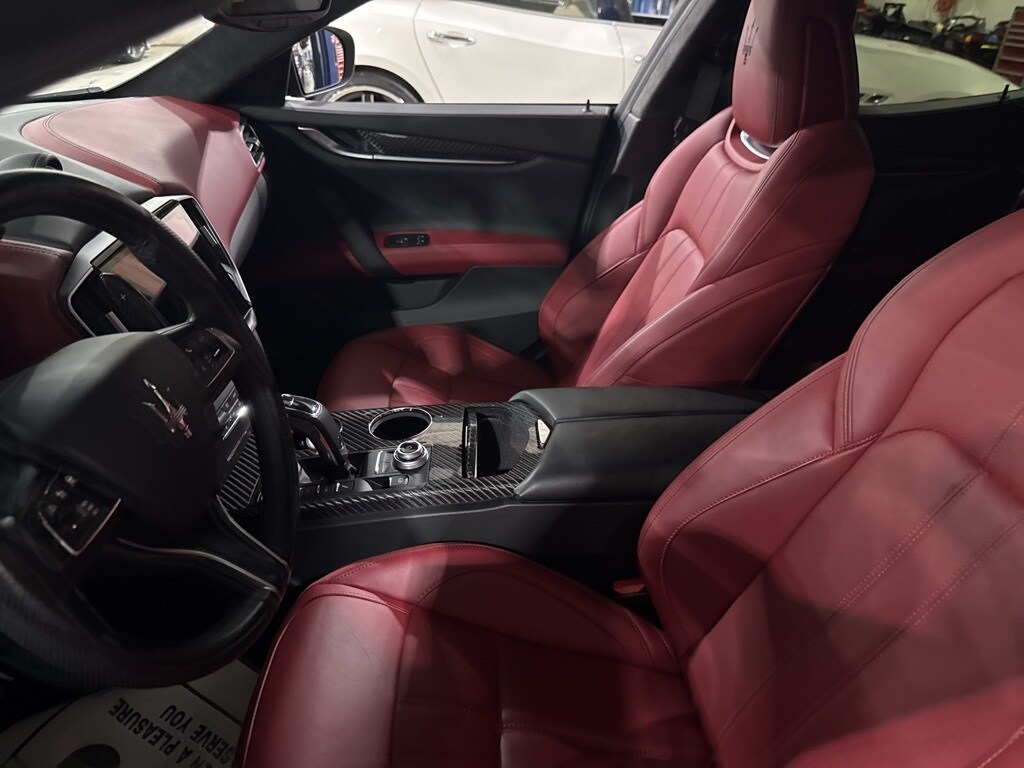 This Ghibli is well equipped with 12-Way Power Heated Front Seats, 4-Wheel Disc Brakes, 8 Speakers, ABS brakes, Air Conditioning, Alloy wheels, Aluminum Column-Mounted Paddle Shifters, AM/FM radio: SiriusXM, Anti-whiplash front head restraints, Apple CarPlay/Android Auto, Auto-dimming door mirrors, Auto-dimming Rear-View mirror, Automatic temperature control, Brake assist, Bumpers: body-color, Compass, Delay-off headlights, Driver door bin, Driver vanity mirror, Dual front impact airbags, Dual front side impact airbags, Electronic Stability Control, Emergency communication system: Maserati Connect, Exterior Parking Camera Rear, Four wheel independent suspension, Front anti-roll bar, Front Bucket Seats, Front Center Armrest w/Storage, Front dual zone A/C, Front reading lights, Garage door transmitter: HomeLink, Heated door mirrors, Heated front seats, Heated steering wheel, High intensity discharge headlights: Bi-Xenon, Illuminated entry, Knee airbag, Leather Shift Knob, Leather steering wheel, Leather Upholstery, Low tire pressure warning, Memory seat, Navigation System, Occupant sensing airbag, Outside temperature display, Overhead airbag, Overhead console, Panic alarm, Passenger door bin, Passenger vanity mirror, Power door mirrors, Power driver seat, Power moonroof, Power passenger seat, Power steering, Power windows, Radio data system, Radio: AM/FM w/Maserati Intelligent Assistant, Rain sensing wipers, Rear anti-roll bar, Rear fog lights, Rear reading lights, Rear seat center armrest, Rear window defroster, Remote keyless entry, Security system, Speed control, Speed-sensing steering, Speed-Sensitive Wipers, Split folding rear seat, Sport steering wheel, Steering wheel memory, Steering wheel mounted audio controls, Tachometer, Telescoping steering wheel, Tilt steering wheel, Traction control, Trip computer, Turn signal indicator mirrors, Variably intermittent wipers, Voltmeter, and Wheels: 19" Silver Poseidone.
