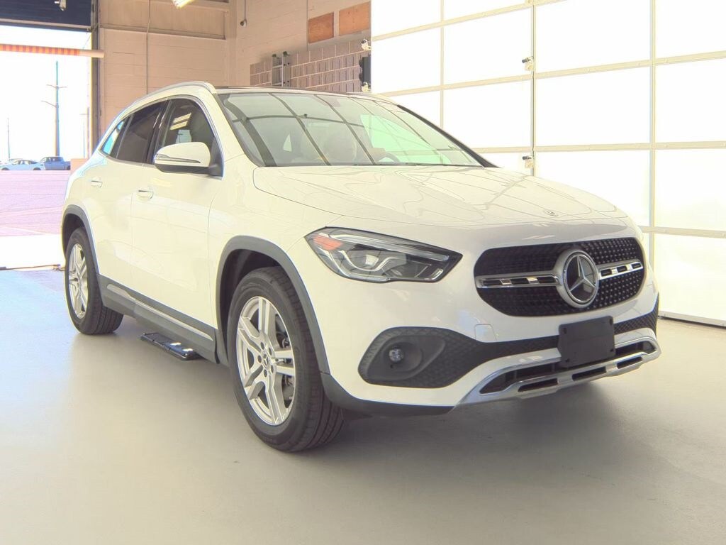 This GLA is well equipped with Premium Package (10.25" Digital Instrument Cluster, 10.25" Media Display w/Touchscreen, Auto Dimming Rearview & Driver's Side Mirrors, Hands-Free Access, KEYLESS GO®, and Power Folding Mirrors), GLA 250 4MATIC®, 4D Sport Utility, 2.0L I4 Turbocharged, 8 Speed Dual Clutch, 4MATIC®, White, Leatherette, Panorama Roof, 4-Wheel Disc Brakes, 6 Speakers, ABS brakes, Air Conditioning, Alloy wheels, AM/FM radio, Apple CarPlay®/Android Auto®, Automatic temperature control, Axle Ratio: TBD, Brake assist, Bumpers: body-color, Child-Seat-Sensing Airbag, Delay-off headlights, Driver door bin, Driver vanity mirror, Dual front impact airbags, Dual front side impact airbags, Electronic Stability Control, Emergency communication system: eCall Emergency System and Active Emergency Stop Assist, Exterior Parking Camera Rear, Four wheel independent suspension, Front anti-roll bar, Front Bucket Seats, Front Center Armrest, Front dual zone A/C, Front fog lights, Front Power Seats, Front reading lights, Fully automatic headlights, Heated door mirrors, Illuminated entry, Knee airbag, Low tire pressure warning, MB-Tex Upholstery, Memory seat, Occupant sensing airbag, Outside temperature display, Overhead airbag, Overhead console, Panic alarm, Passenger door bin, Passenger vanity mirror, Power door mirrors, Power driver seat, Power Liftgate, Power passenger seat, Power steering, Power windows, Radio data system, Radio: MBUX Multimedia System, Rain sensing wipers, Rear anti-roll bar, Rear fog lights, Rear reading lights, Rear window defroster, Rear window wiper, Remote keyless entry, Roof rack: rails only, Security system, Speed control, Speed-sensing steering, Split folding rear seat, Spoiler, Steering wheel mounted audio controls, Tachometer, Telescoping steering wheel, Tilt steering wheel, Traction control, Trip computer, Turn signal indicator mirrors, Variably intermittent wipers, and Wheels: 18" Twin 5-Spoke.