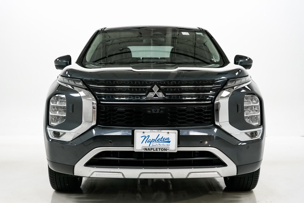 This Outlander is well equipped with 4WD, Active Cruise Control, Android Auto & Apple CarPlay, Exterior Parking Camera Rear, Front dual zone A/C, Heated door mirrors, Heated Front Bucket Seats, Navigation System, Power Liftgate, Radio: AM/FM 9.0" Navigation w/Smartphone Link, Wheels: 20" Two-Tone Alloy, 3rd row seats: split-bench, 4-Wheel Disc Brakes, 5.694 Axle Ratio, 6 Speakers, ABS brakes, Air Conditioning, Alloy wheels, AM/FM radio: SiriusXM, Auto High-beam Headlights, Automatic temperature control, Brake assist, Bumpers: body-color, Driver door bin, Driver vanity mirror, Dual front impact airbags, Dual front side impact airbags, Electronic Stability Control, Emergency communication system: Mitsubishi Connect w/ 24-month trial, Four wheel independent suspension, Front anti-roll bar, Front Bucket Seats, Front Center Armrest w/Storage, Front fog lights, Front reading lights, Fully automatic headlights, Headlight cleaning, Heated front seats, Illuminated entry, Knee airbag, Leather Shift Knob, Leather steering wheel, Low tire pressure warning, Occupant sensing airbag, Outside temperature display, Overhead airbag, Overhead console, Panic alarm, Passenger door bin, Passenger vanity mirror, Power door mirrors, Power driver seat, Power steering, Power windows, Radio data system, Rain sensing wipers, Rear anti-roll bar, Rear seat center armrest, Rear side impact airbag, Rear window defroster, Rear window wiper, Reclining 3rd row seat, Remote keyless entry, Security system, Speed control, Speed-Sensitive Wipers, Split folding rear seat, Spoiler, Steering wheel mounted audio controls, Synthetic Leather Seat Trim, Tachometer, Telescoping steering wheel, Tilt steering wheel, Traction control, Trip computer, Turn signal indicator mirrors, and Variably intermittent wipers.