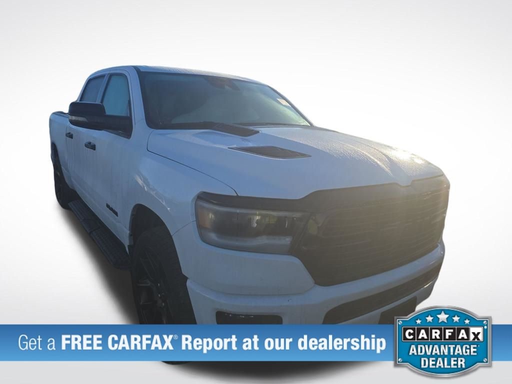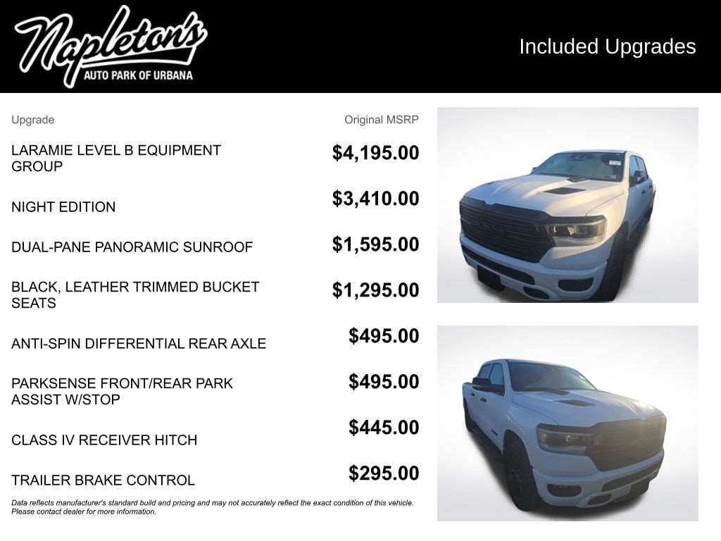 This stunning Ram 1500 Laramie Night Edition is more than just a capable off-road companion; it's a true expression of style and luxury. The bold, blacked-out exterior features a sport performance hood, 22-inch forged aluminum wheels, and a distinctive grille, creating a commanding presence on the road. Step inside the cabin, and you'll be enveloped in premium leather-trimmed bucket seats, complemented by the convenience of a full-length upgraded floor console.