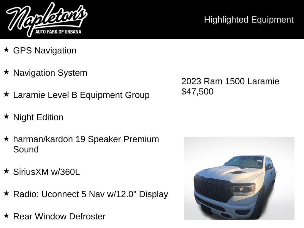 Elevate your driving experience with the 2023 Ram 1500 Laramie Night Edition with Level B Equipment Group. This exceptional truck combines uncompromising power, refined style, and a wealth of premium features to provide an unparalleled ownership experience. Visit our showroom today and let us demonstrate how this remarkable Ram can transform your daily drives and weekend adventures.