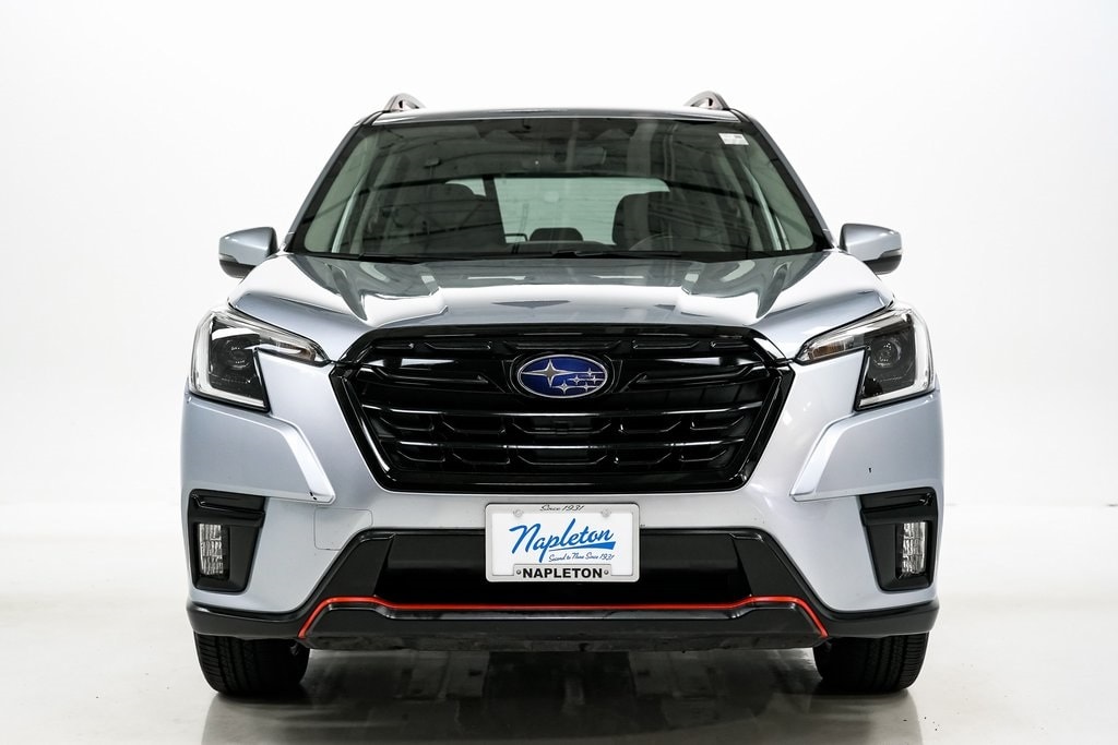 This Forester is well equipped with 8" Audio w/harman/kardon & RAB & Power Rear Gate (harman/kardon 576W Amp & Speaker System, Radio: Subaru Starlink 8.0" Multimedia Plus System, Reverse Automatic Braking System (RAB), and Power Rear Gate), Popular Package #3 (All-Weather Floor Liners, Auto-Dimming Exterior Mirror w/Approach Lighting, Auto-Dimming Mirror w/Compass & HomeLink, Rear Bumper Cover, and Rear Seatback Protector), Exterior Parking Camera Rear, Heated Front Bucket Seats, Power moonroof: Panoramic, STARLINK/Apple CarPlay/Android Auto, Wheels: 18" x 7.0J Black Finish Aluminum Alloy, 3.70 Axle Ratio, 4-Wheel Disc Brakes, 6 Speakers, ABS brakes, Air Conditioning, Alloy wheels, AM/FM radio: SiriusXM, Anti-whiplash front head restraints, Auto High-beam Headlights, Automatic temperature control, Brake assist, Bumpers: body-color, CD player, Driver door bin, Driver vanity mirror, Dual front impact airbags, Dual front side impact airbags, Electronic Stability Control, Emergency communication system: STARLINK Safety and Security (Subscription Required), Four wheel independent suspension, Front anti-roll bar, Front Bucket Seats, Front Center Armrest, Front fog lights, Front reading lights, Fully automatic headlights, Heated door mirrors, Heated front seats, Illuminated entry, Knee airbag, Leather Shift Knob, Low tire pressure warning, Occupant sensing airbag, Outside temperature display, Overhead airbag, Overhead console, Panic alarm, Passenger door bin, Passenger vanity mirror, Power door mirrors, Power driver seat, Power steering, Power windows, Radio data system, Rear anti-roll bar, Rear seat center armrest, Rear window defroster, Rear window wiper, Remote keyless entry, Roof rack: rails only, Security system, Speed control, Speed-sensing steering, Splash Guards, Split folding rear seat, Spoiler, Sport Cloth Upholstery, Steering wheel mounted audio controls, Tachometer, Telescoping steering wheel, Tilt steering wheel, Traction control, Trip computer, Turn signal indicator mirrors, and Variably intermittent wipers.