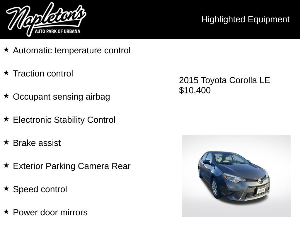 Boasting a clean CARFAX history and well-maintained condition, this 2015 Toyota Corolla LE is a testament to the brand's renowned reliability and longevity. With its impressive list of features and the peace of mind that comes with Toyota's reputation, this Corolla is an exceptional value proposition.