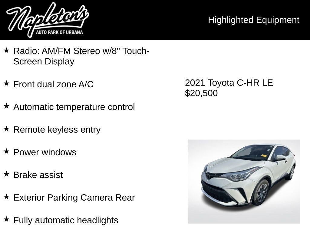 This 2021 Toyota C-HR LE is not just a practical and efficient crossover it's a true expression of your personal style. With its sleek and modern design, this vehicle is sure to turn heads wherever you go. And with a list price of just $20,500, it's an exceptional value that you won't want to miss.