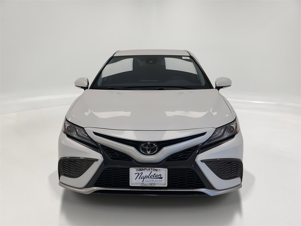 This Camry is well equipped with Cold Weather Package (Heated Steering Wheel), Camry XSE, 4D Sedan, 2.5L I4 DOHC 16V, 8-Speed Automatic, FWD, Celestial Silver Metallic, Black w/Perforated Leather Seat Trim, 4-Wheel Disc Brakes, 6 Speakers, ABS brakes, Air Conditioning, Alloy wheels, AM/FM radio: SiriusXM, Apple CarPlay/Android Auto, Auto High-beam Headlights, Auto-dimming Rear-View mirror, Automatic temperature control, Brake assist, Bumpers: body-color, Delay-off headlights, Driver door bin, Driver vanity mirror, Dual front impact airbags, Dual front side impact airbags, Electronic Stability Control, Emergency communication system: Safety Connect with 1-year trial, Exterior Parking Camera Rear, Four wheel independent suspension, Front anti-roll bar, Front Bucket Seats, Front Center Armrest, Front dual zone A/C, Front reading lights, Fully automatic headlights, Garage door transmitter: HomeLink, Heated door mirrors, Heated front seats, Illuminated entry, Knee airbag, Low tire pressure warning, Multi-Stage Heated Front Bucket Seats, Occupant sensing airbag, Outside temperature display, Overhead airbag, Overhead console, Panic alarm, Passenger door bin, Passenger vanity mirror, Perforated Leather Seat Trim, Power door mirrors, Power driver seat, Power passenger seat, Power steering, Power windows, Radio data system, Radio: AM/FM/HD Audio Plus, Rear anti-roll bar, Rear reading lights, Rear seat center armrest, Rear side impact airbag, Rear window defroster, Remote keyless entry, Security system, Speed control, Speed-sensing steering, Split folding rear seat, Spoiler, Steering wheel mounted audio controls, Tachometer, Telescoping steering wheel, Tilt steering wheel, Traction control, Trip computer, Turn signal indicator mirrors, Variably intermittent wipers, and Wheels: 8.0J x 19" Black Machined-Finish Alloy.
