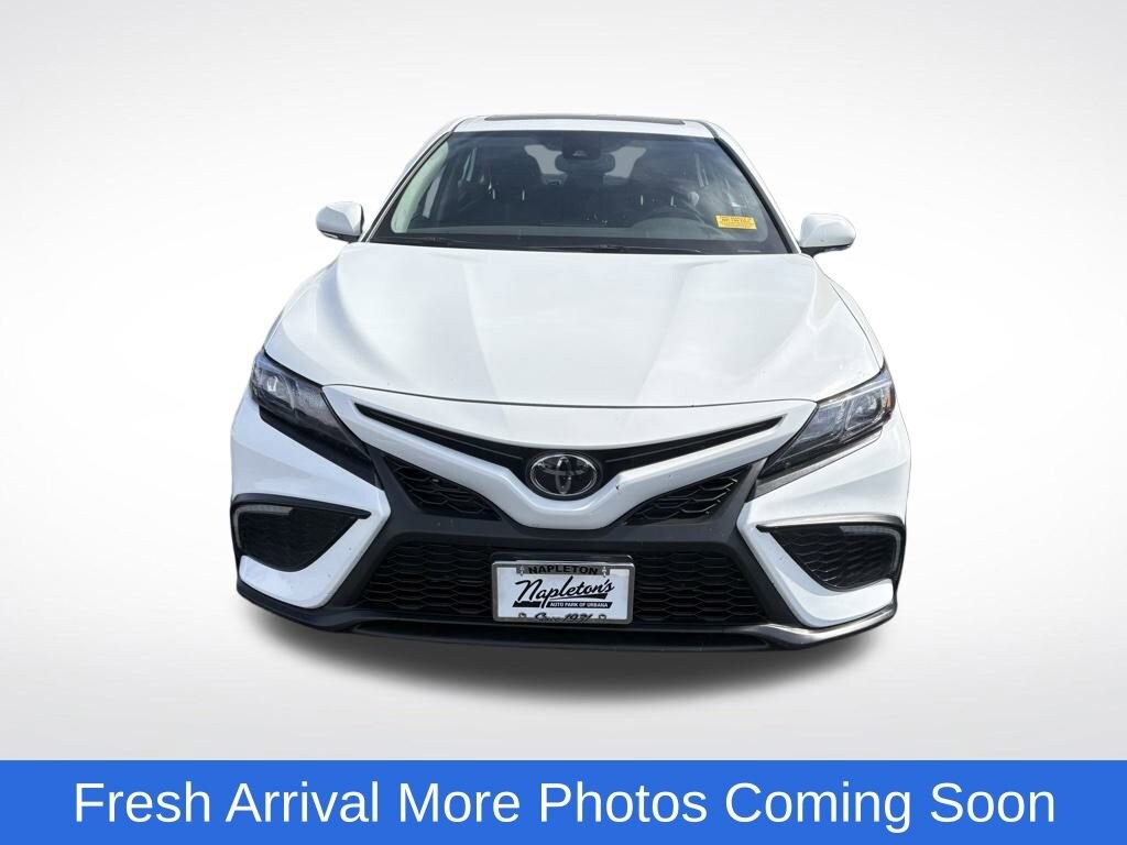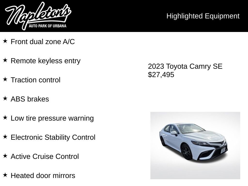 2023 Toyota Camry SE White 2.5L I4 DOHC 16V FWD 8-Speed Automatic ABS brakes, Active Cruise Control, Alloy wheels, Electronic Stability Control, Front dual zone A/C, Heated door mirrors, Illuminated entry, Low tire pressure warning, Remote keyless entry, Traction control.