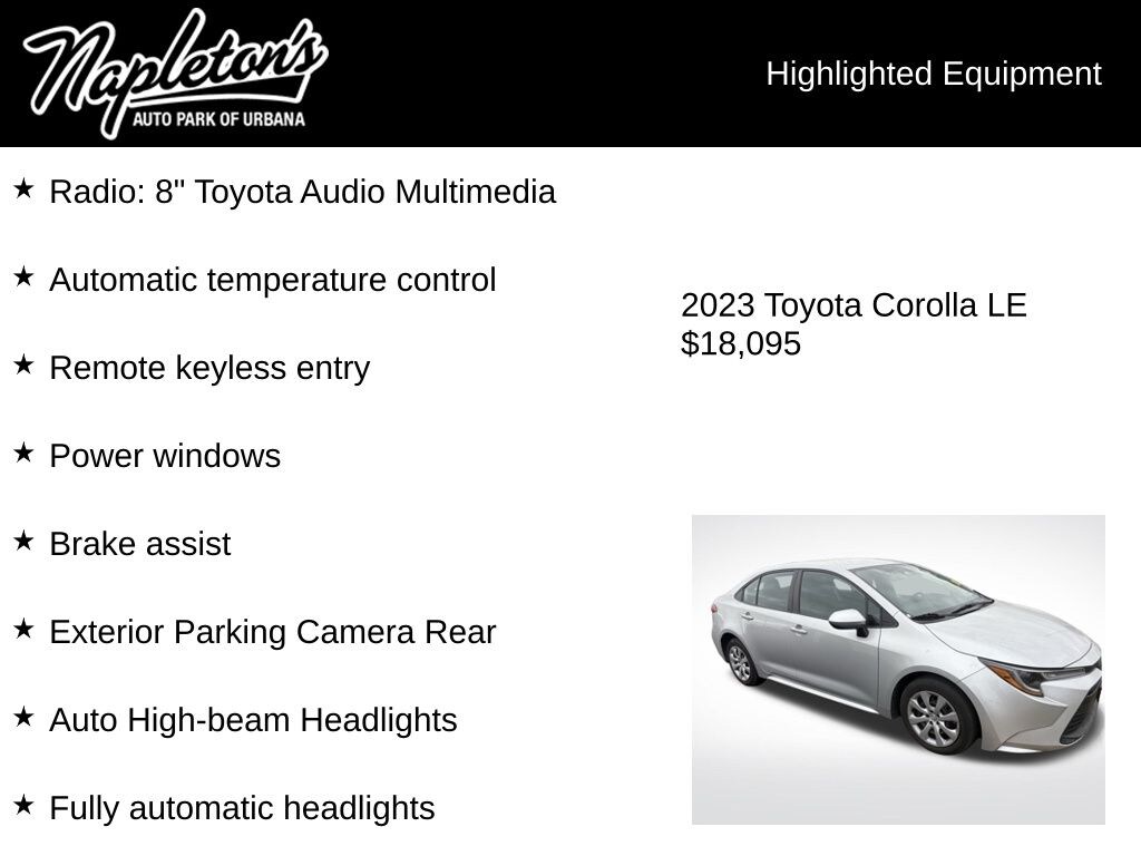 Whether you're commuting to work, running errands, or embarking on a weekend getaway, the 2023 Toyota Corolla LE is the perfect companion. Experience the perfect blend of style, efficiency, and advanced technology today. Visit our showroom to take this remarkable vehicle for a test drive and discover why the Corolla LE should be your next automotive investment.
