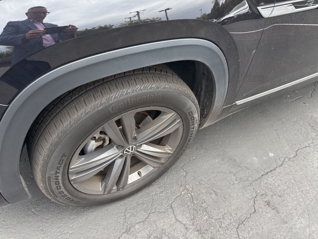 This Atlas is well equipped with Panoramic Sunroof Package (Panoramic Sunroof), Towing Package, 2nd-Row Dual Captain's Chairs, 3.60 Axle Ratio, 3rd row seats: split-bench, 4-Wheel Disc Brakes, 6 Speakers, ABS brakes, Air Conditioning, Alloy wheels, Auto-dimming Rear-View mirror, Automatic temperature control, Brake assist, Bumpers: body-color, Compass, Delay-off headlights, Driver door bin, Driver vanity mirror, Dual front impact airbags, Dual front side impact airbags, Electronic Stability Control, Emergency communication system: VW Car-Net services (capabilities require enrollment or subscription), Exterior Parking Camera Rear, Forward collision: FCW w/Autonomous Emergency Braking mitigation, Four wheel independent suspension, Frameless Self-Dimming Rearview Mirror, Front anti-roll bar, Front Bucket Seats, Front Center Armrest, Front dual zone A/C, Front fog lights, Front reading lights, Fully automatic headlights, Heated Comfort Front Bucket Seats, Heated door mirrors, Heated front seats, Heavy Duty Trunk Liner w/VW CarGo Blocks, Illuminated entry, Leather Shift Knob, Low tire pressure warning, Occupant sensing airbag, Outside temperature display, Overhead airbag, Overhead console, Panic alarm, Passenger door bin, Passenger vanity mirror, Perforated V-Tex Leatherette Seating Surfaces, Power door mirrors, Power driver seat, Power Liftgate, Power steering, Power windows, Radio data system, Rain sensing wipers, Rear air conditioning, Rear anti-roll bar, Rear reading lights, Rear seat center armrest, Rear window defroster, Rear window wiper, Remote keyless entry, Roof rack: rails only, Rubber Mats Kit - Captain's Chairs, Security system, Speed control, Speed-sensing steering, Split folding rear seat, Spoiler, Sport steering wheel, Standard Suspension, Steering wheel mounted audio controls, Tachometer, Telescoping steering wheel, Tilt steering wheel, Traction control, Trip computer, Turn signal indicator mirrors, Variably intermittent wipers, and Wheels: 20" Twin 5-Spoke Dark Graphite Alloy.